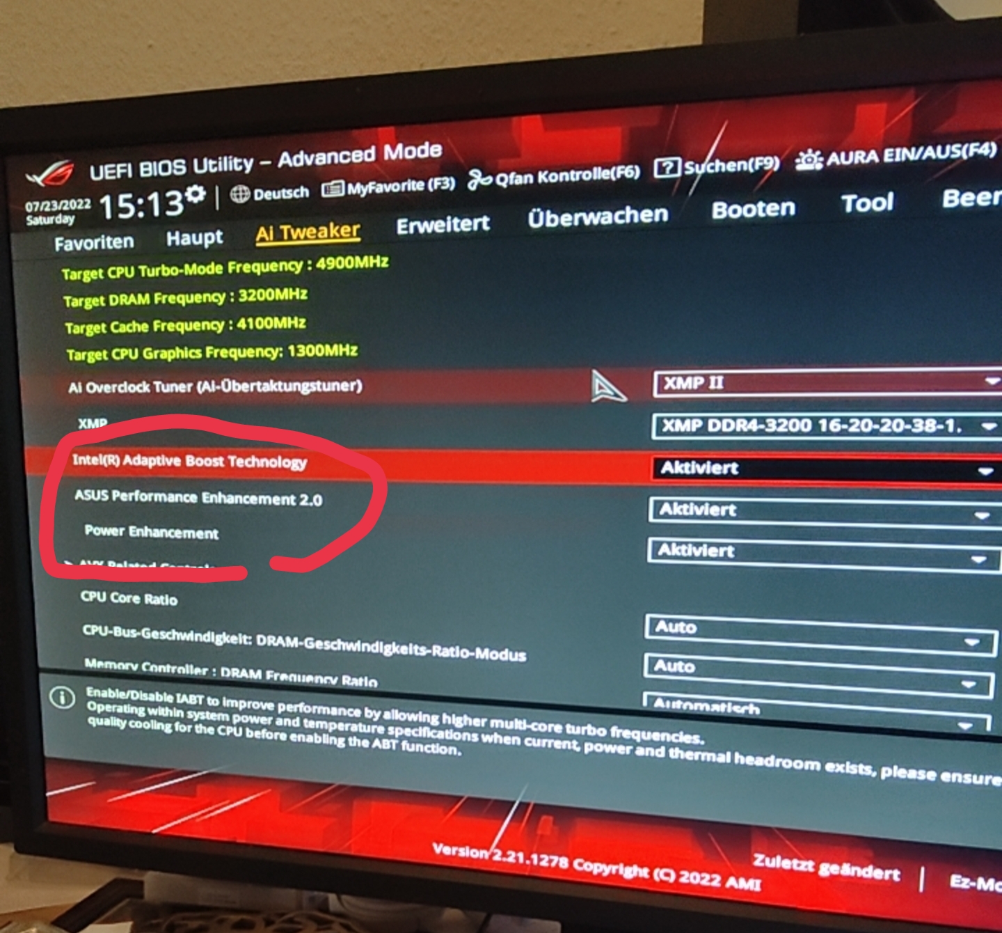 Ich würde gerne den korrekten Boosttakt aus der CPU rausholen 4.9 GHz. Allerdings gibt es im BIOS einmal diesen Intel Boost und den Asus Performance Enhancer. Ich bräuchte da etwas Hilfe was davon ich einstelle damit ich das beste aus der CPU rausholen ohne sie richtig zu übertakten (obwohl es schon schön wäre alle 6 Kerne auf 4.9 GHz zu haben aber das ist glaube ich nicht möglich mit den Settings). Also was davon soll ich aus/an stellen und warum?