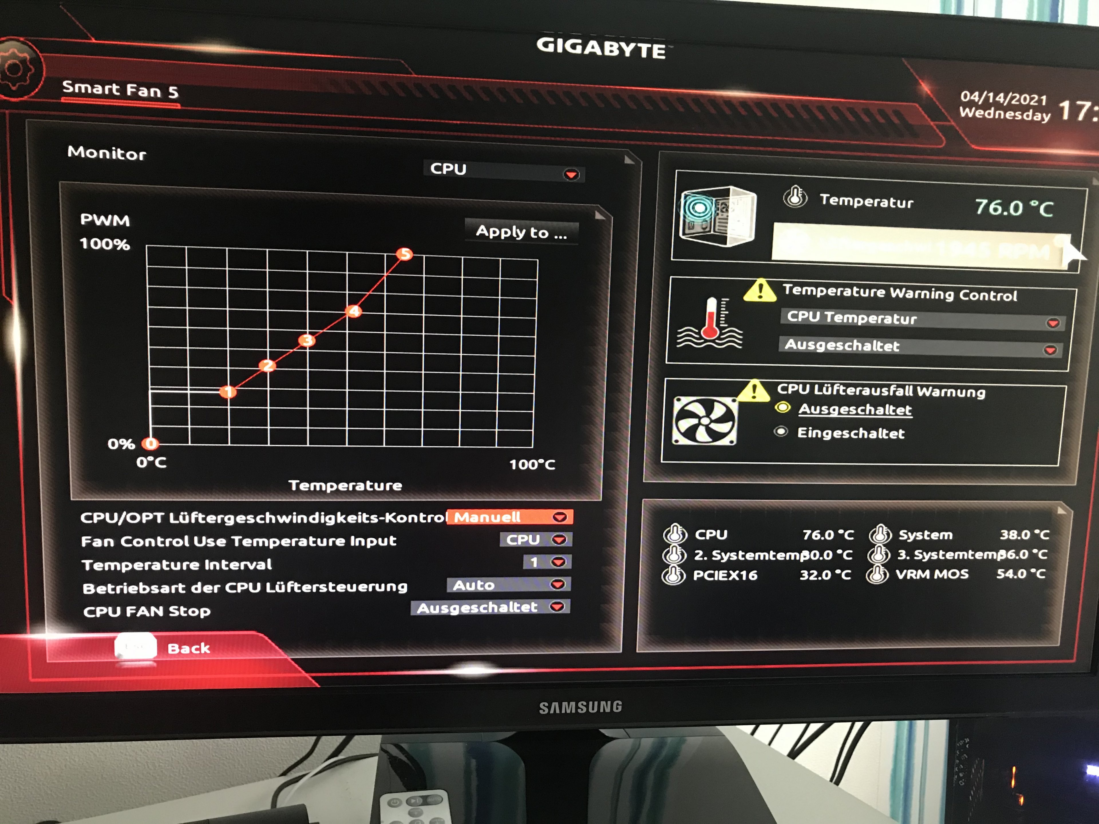 Ich sehe gerade die Temperatur im BIOS. 76 Grad sind ungefähr doppelt so hoch wie es im Normalfall sein soll.