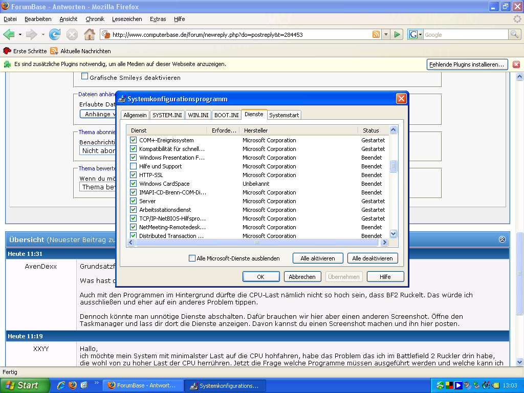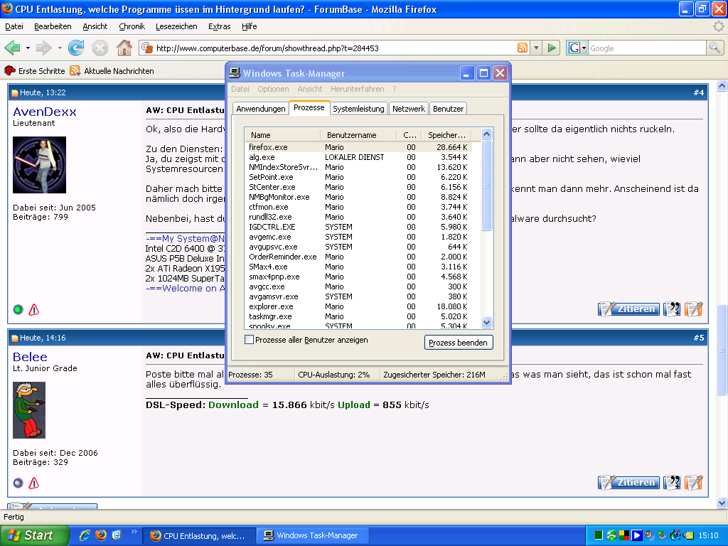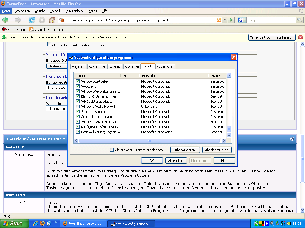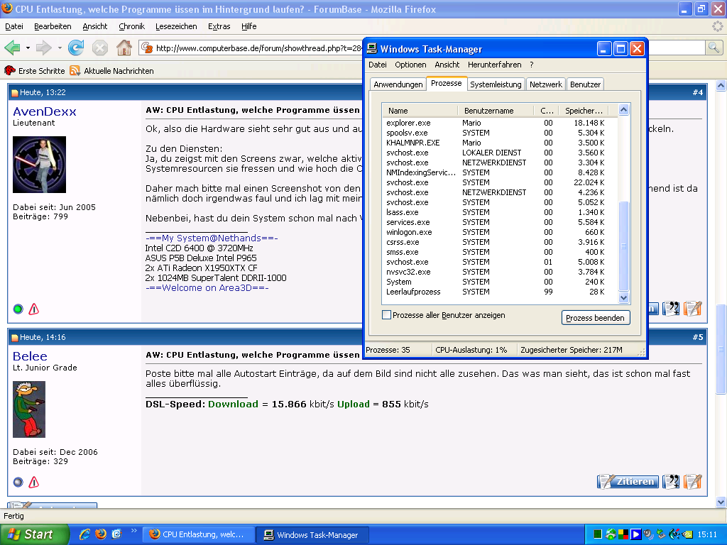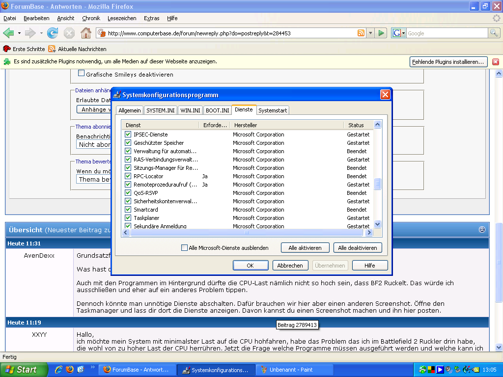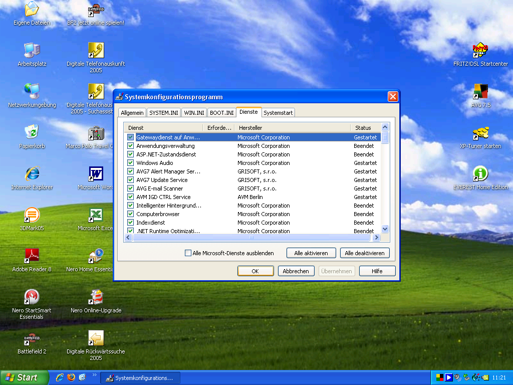 ich möchte mein System mit minimalster Last auf die CPU hohfahren, habe das Problem das ich im Battlefield 2 Ruckler drin habe, die wohl von zu hoher Last der CPU herrühren. Jetzt die Frage welche Programme müssen ausgeführt werden und welche kann ich unter MS config ausschalten?