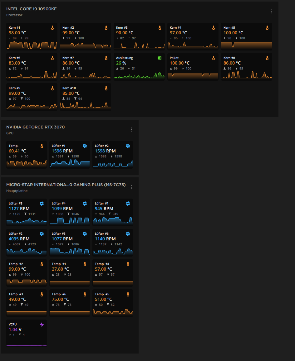 Mein PC ist seit kurzem extrem laut geworden, als ich über Corsair Link nachschaute waren die Temperaturen nahe bei 100 Grad obwohl ich nur im Internet surfte. Ausserdem hat ein komisches Geräusch angefangen. Immer wenn ich einmal auf den PC schlage geht es wieder für kurze Zeit weg. Dieses Geräusch kommt von der AiO, aber keine Ahnung wie und warum es erzeugt wird.