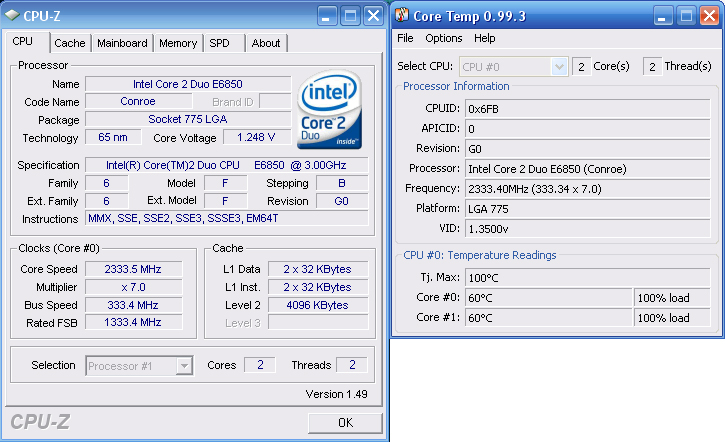 Im Anhang noch ein Screenshot von CPU-Z und Core-Temp unter Volllast der CPU (mit Prime95).