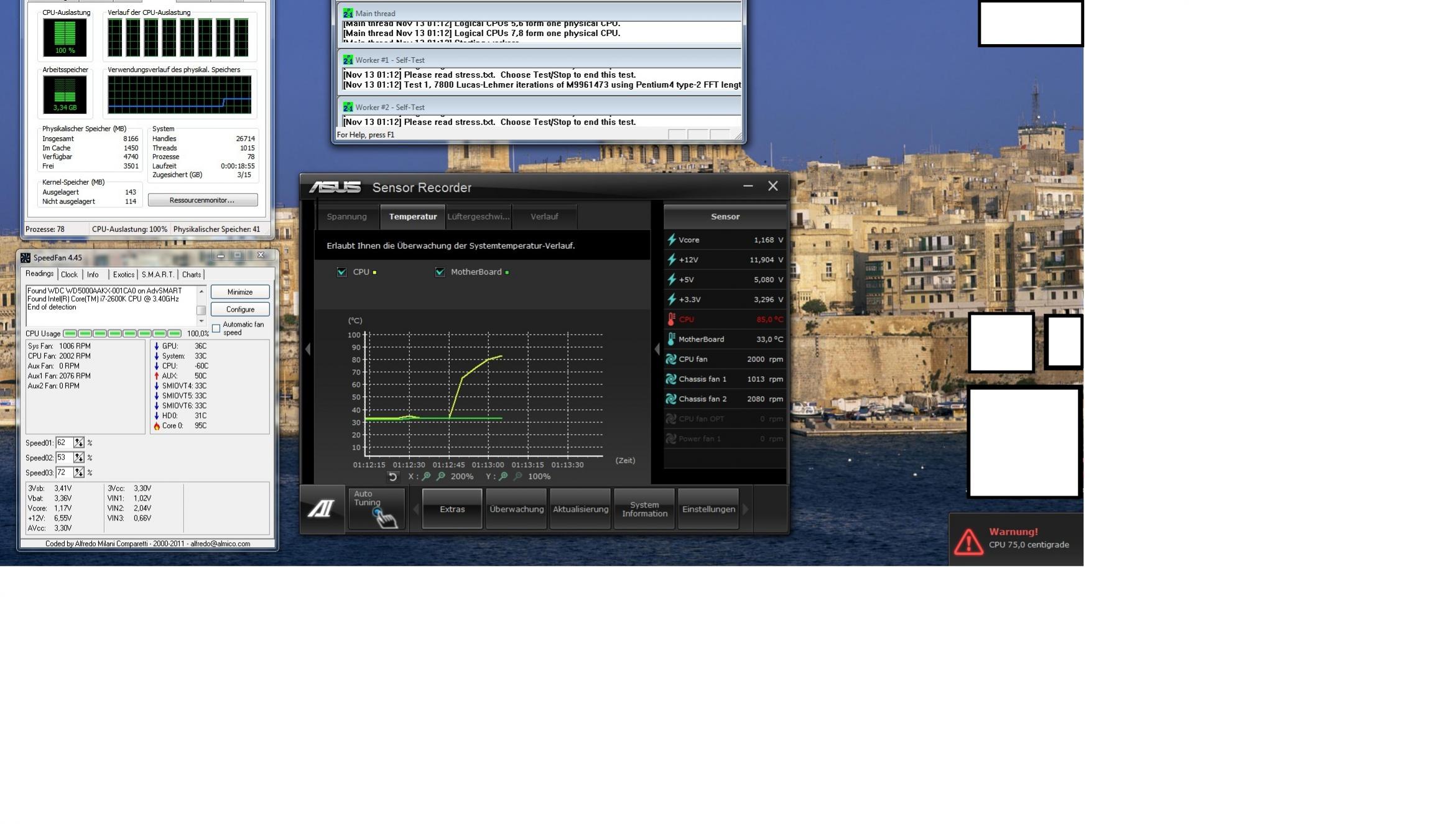 -Anschließend habe ich den Prime95 Stresstest gemacht und erreiche ca. 95° mit dem original Intel Kühler.