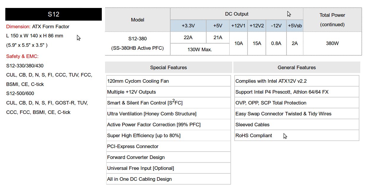 Anhang: Seasonic S12-380 (SS-380HB Active PFC) Netzteil Specs: