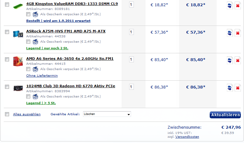 Athlon II X2 270...........2 x 3,4 GHz.......65W........52,81€