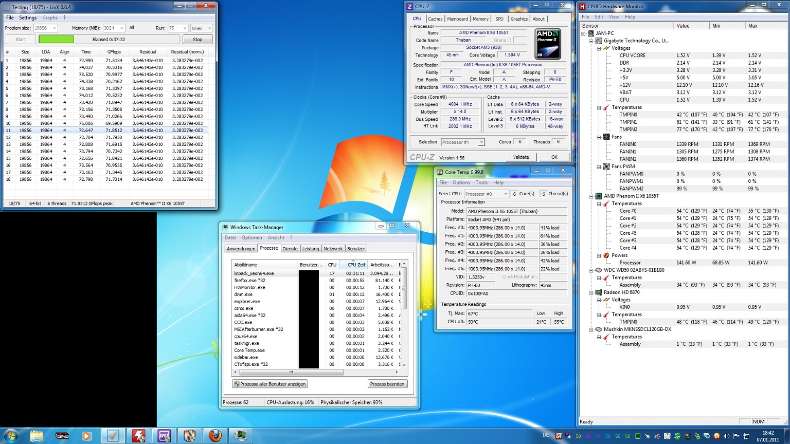 Oder Rampage III Extreme mit Xeon W3690 auf 5 GHz, Cinebench lief damit durch. Zum Zocken 4,8 GHz. Stock: 3,46 GHz. Spannungen weiß ich nicht mehr.