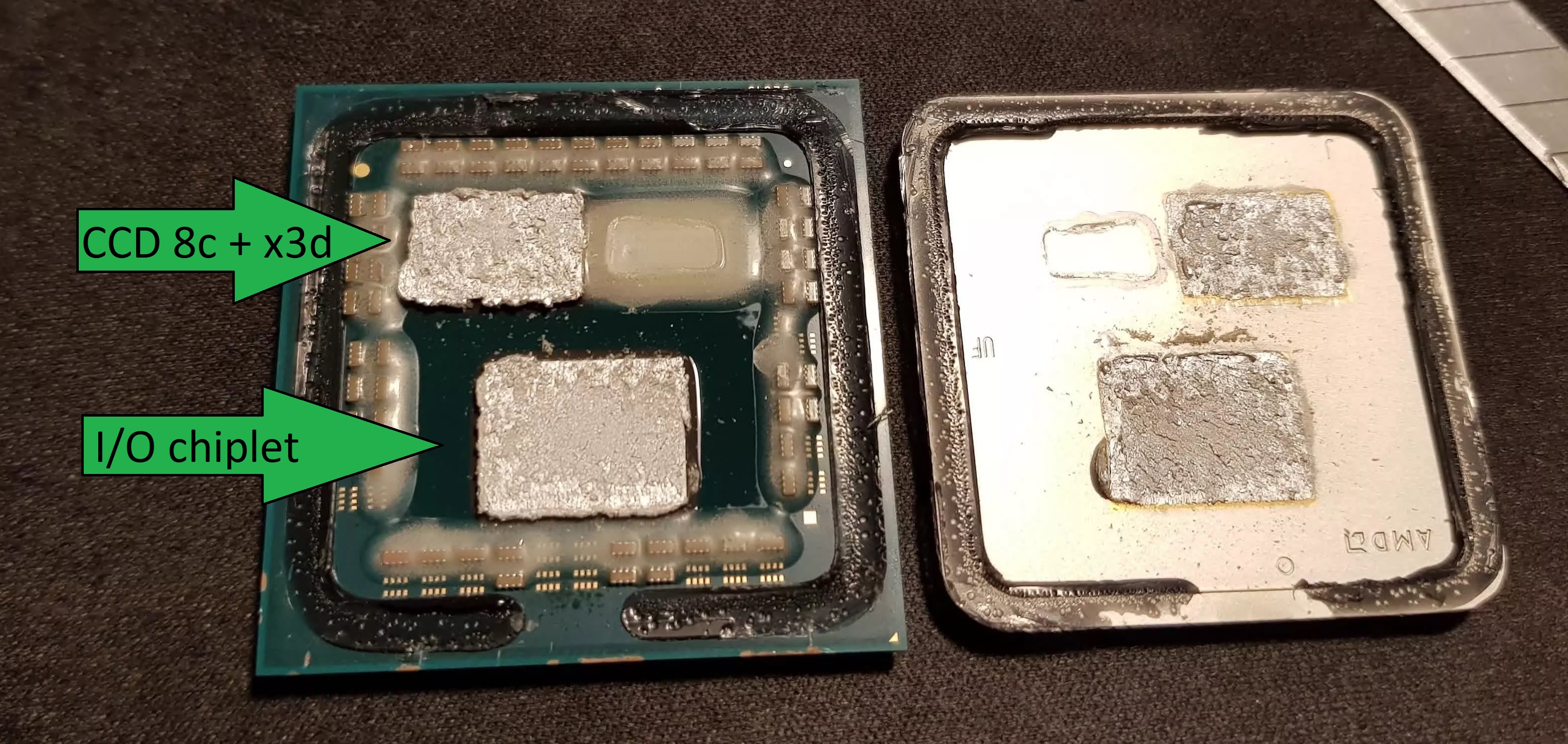 Edit: Hier mal ein geköpfter 7800X3D eine geköpfte AM4-CPU. Da siehst du, wie klein die eigentliche Chipfläche (CCD) ist. Das andere ist nur der I/O Chip. Drauf ist noch das Lot, das die Wärme zum rechts liegenden Heatspreader überträgt.