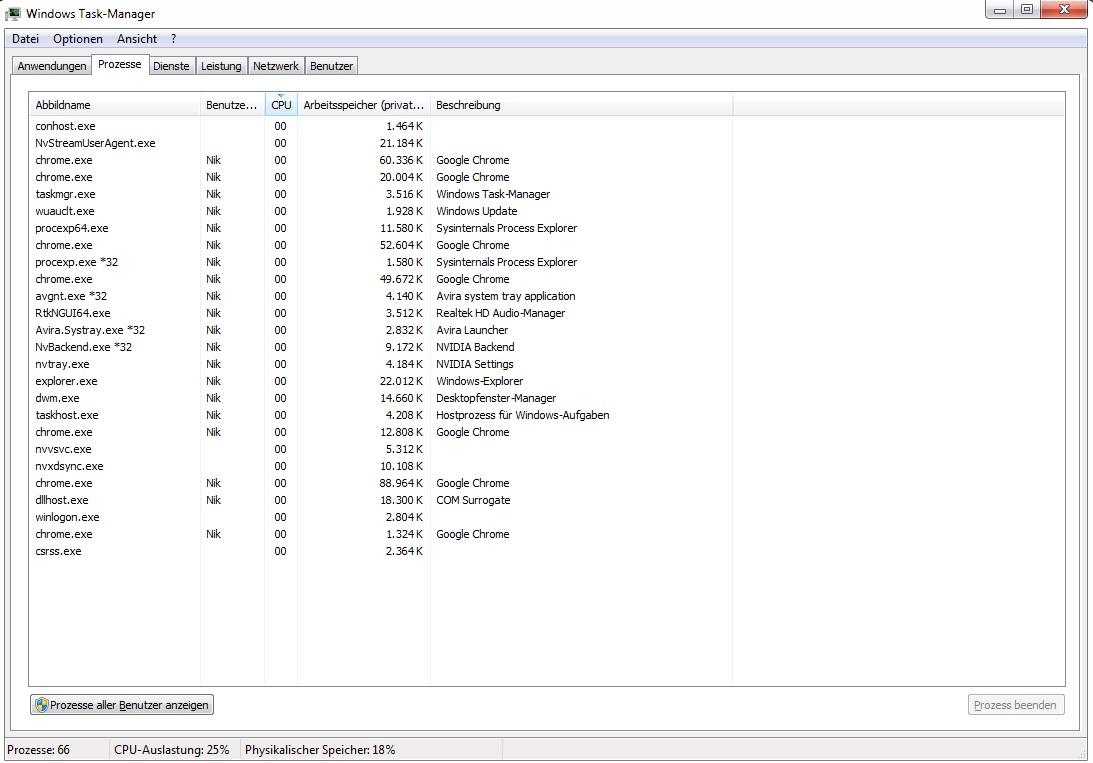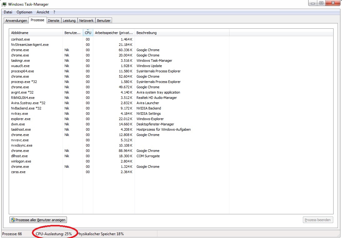 Erklären kann ich mir das nicht, da ich keinerlei sonstige Anwendungen laufen habe (überprüft mit dem Taskmanager). Virenschutz ist Avira Antivir. Testweise hab ich das deaktiviert, aber brachte keine Besserung. Virentest hab ich komplett durchllaufen lassen, keine Funde.