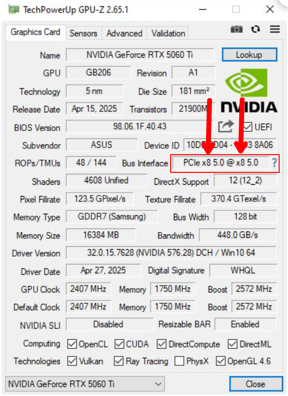 Information: In GPU-Z bezieht sich der erste Wert darauf, was die Grafikkarte kann, und der zweite Wert darauf, was tatsächlich anliegt. Zum Beispiel, wenn meine Grafikkarte LANs genommen werden würde, dann würde der erste Wert auf x16 stehen und der zweite Wert auf x8.