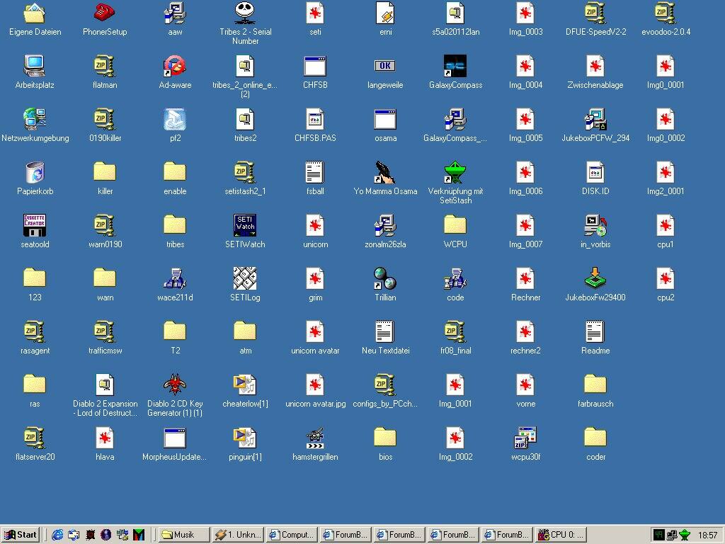 Soll das eine Anspielung auf meine Ordnung sein? Ne, das ist normal bei mir. Immer wenn ich mir was sauge, CD´s einlege und so....alles landet komischerweise auf meinen Desktop und versperrt mir die Sicht. Ich kann machen was ich will, ich habe sogar einen Ordner namens "Schrott" wo ich die Sachen alle paar Tage reinschiebe. Aber es hilft nicht, muß wohl der "Desktopzumüllvirus" sein. Mit was ich den 8 cm Enermax Lüfter befestigt habe? Mit Schrauben, was sonst? :p Auf dem Bild sieht man keine einzige, war gerade dabei die Teile umzubauen und habe es für die Fotosession provisorisch draufgelegt. Denke dir einfach 4 Schrauben ans Lüftergitter, und 4 Schrauben eine Etage tiefer. Jedenfalls ist mein PC jetzt ungeahnt leise, und wenn ich voll aufdreh habe ich mehr Kühlpotenzial als mit der alten Turbine. :cool_alt: