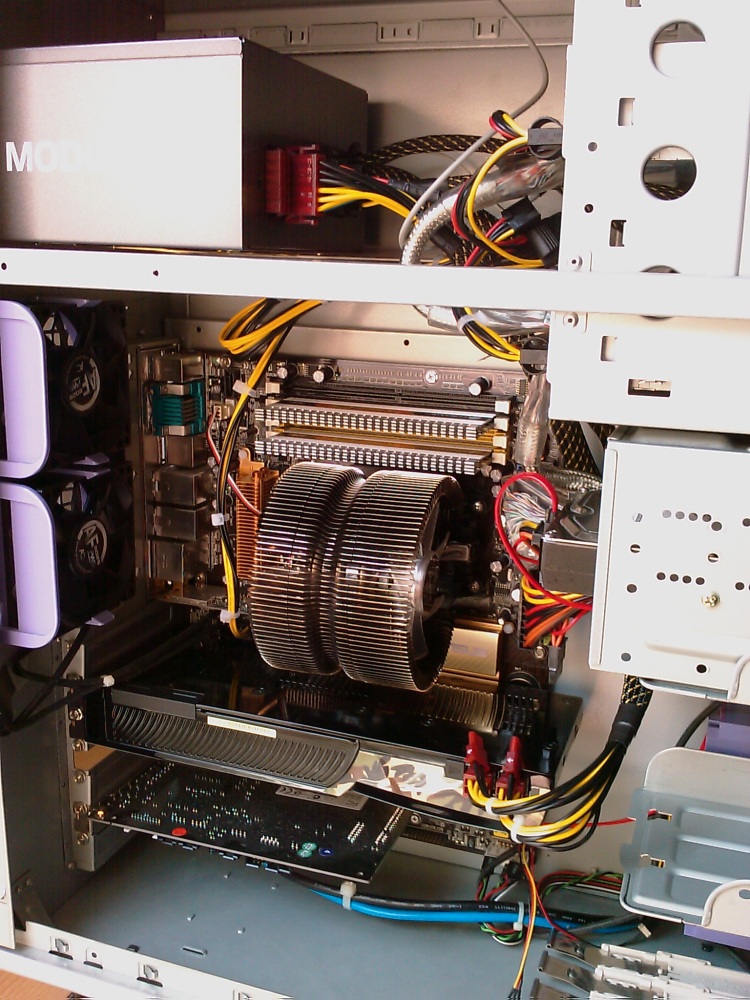 Ich bin auf der Suche nach einem leistungsfähigen und gleichzeitig nicht allzu lauten CPU Kühler für mein Phenom II X4 940, der sich auf meinem M2N32-SLI Deluxe befindet und von einem Zalman CNPS 9500 gekühlt wird, der allerdings natürlich auch bei den jetzigen Temperaturen schwächelt (siehe auch rote Signatur). Allerdings bietet das Board (in einem alten Chieftech CS-601 Gehäuse) nicht gerade viel Platz drumherum (siehe Bild). Bei den Speicherreigeln wirds knapp und nach unten hin zur Grafikkarte ist wird´s auch eng. Hat irgendjemand schon mit diesem Board und einigen neueren Kühlern Erfahrung bezüglich des Platzes. Ich dachte da an leistungsfähige Kühler wie der EKL Alpenföhn Groß Clockner oder Nordwand oder Modelle von Xigmatec / Scythe, die aber glaube ich sehr schwer zu integrieren sind. Am besten natürlich auch so montiert, dass der Luftstrom waagerecht verläuft, wie es jetzt im Moment der Fall ist. Würde mich auf eure Ratschläge freuen.