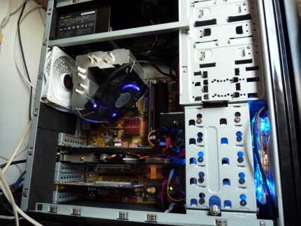 Mein Gehäuse ist ein Thermaltake Soprano, zieht also vorne (120er) und an der Seite (80er) Luft. Und hinten bläst ein 120er raus.