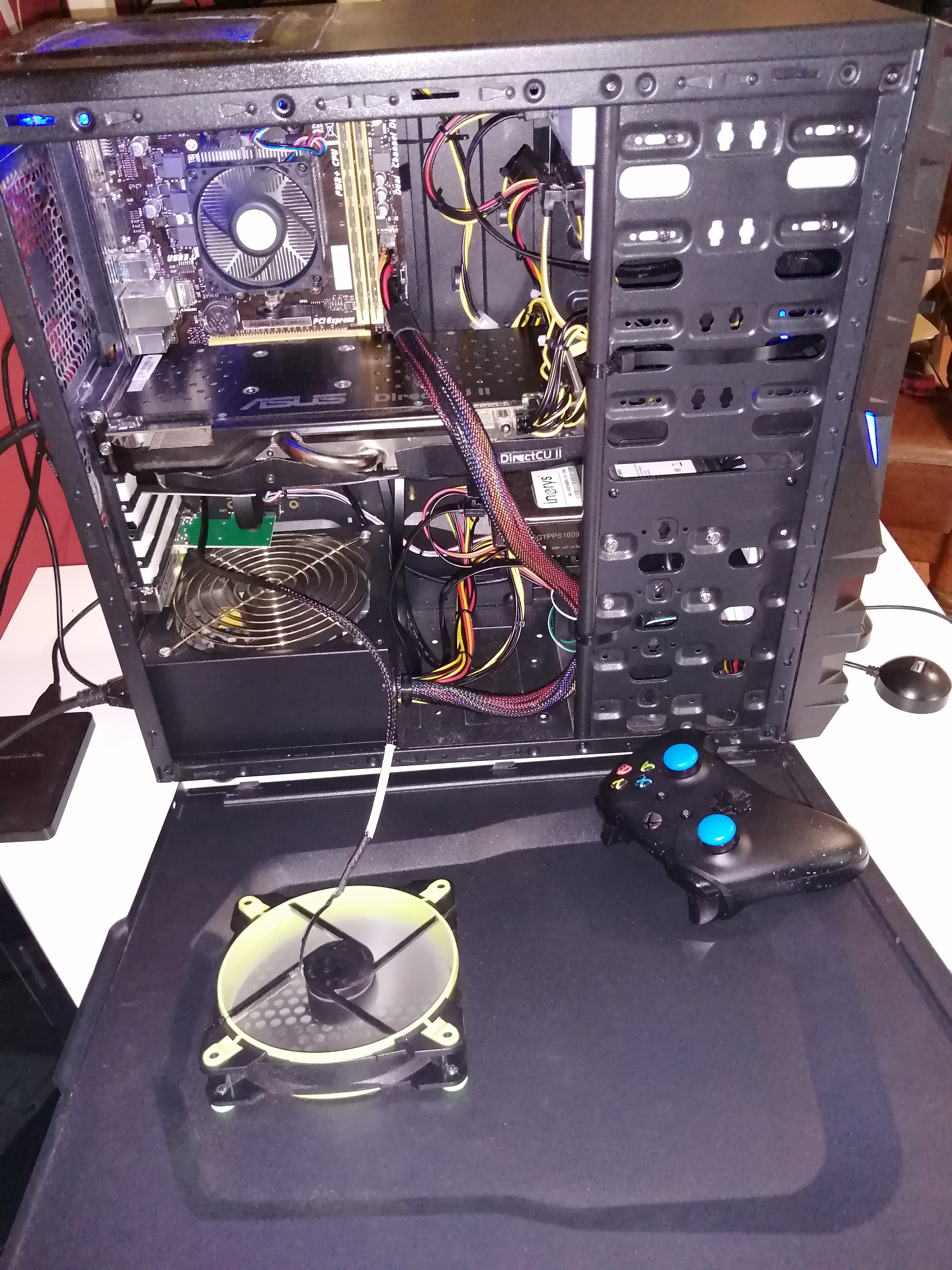 habe unten vorne ein Lüfter der Luft einbläst an der Seite direkt an der GK Ein Lüfter der einbläst und oben an der Decke einen der ausblässt