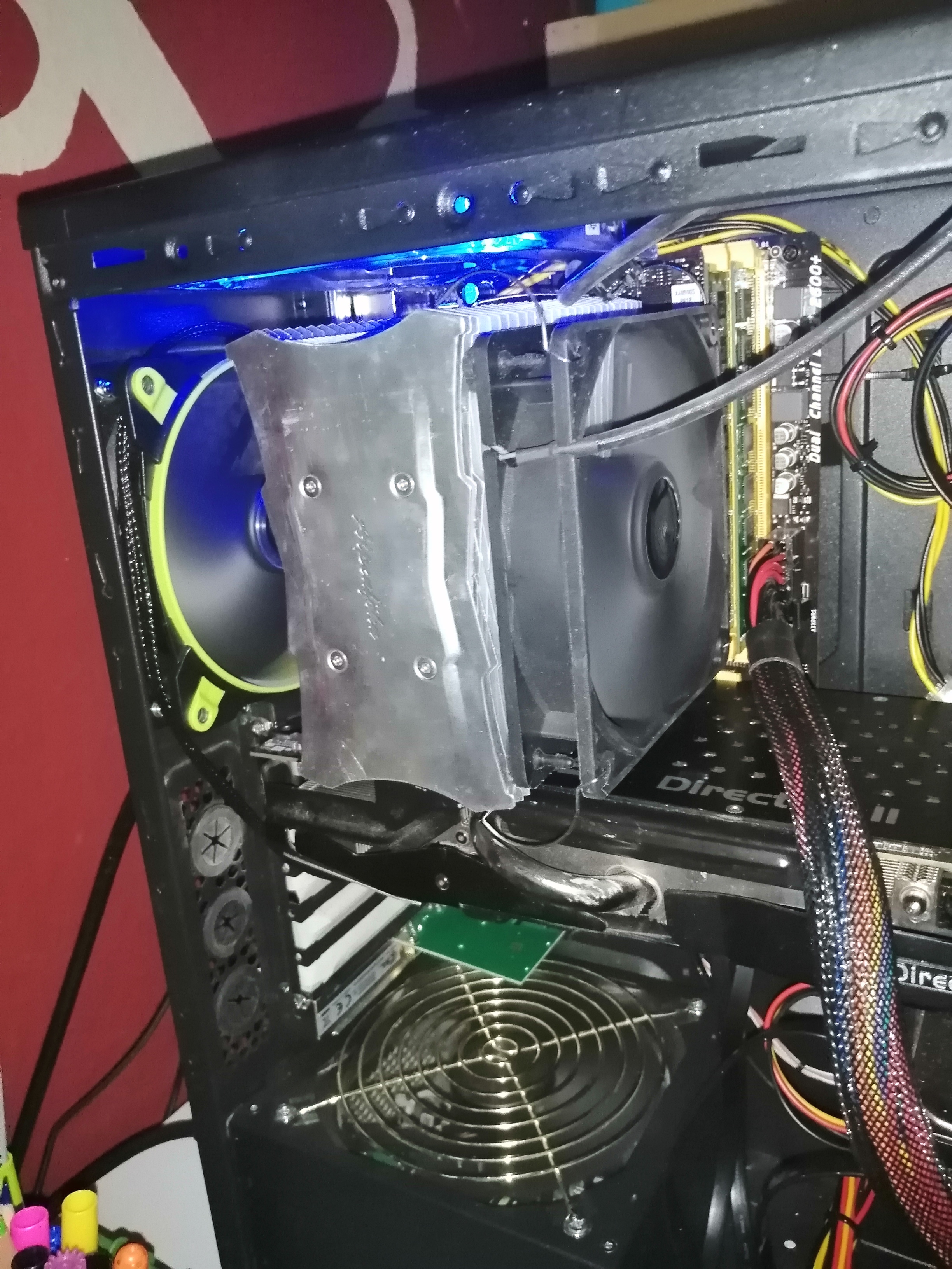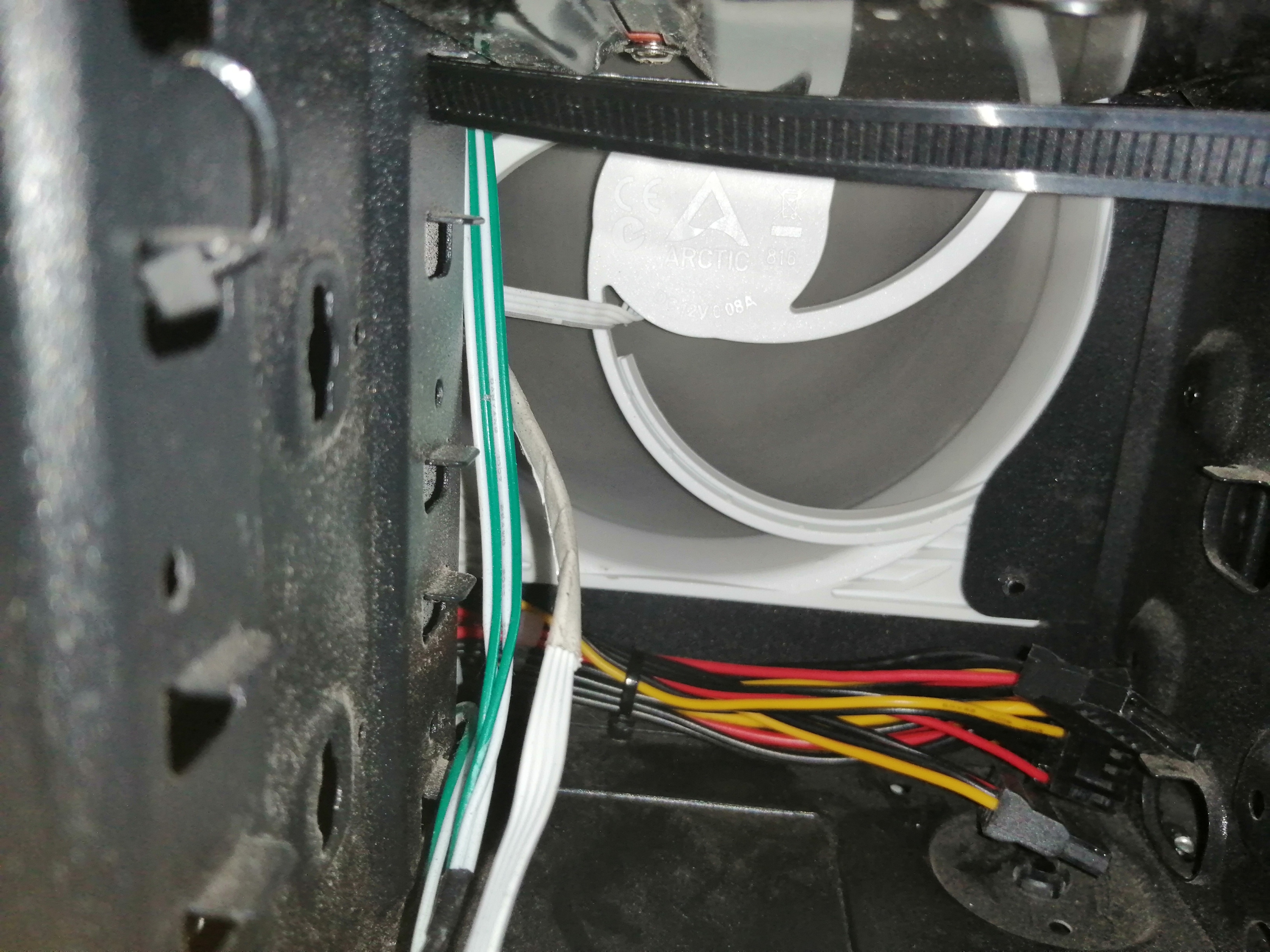 Der Lüfter bläst raus aus dem Gehäuse, wenn ich es richtig sehe. Der Topblower-Lüfter bläst ja auf den Kühlkörper der CPU. Die beiden Lüfter sitzen sich ja mehr oder weniger genau gegenüber. Ist das eine gute Kombination, das so zu montieren? Ich hatte den seitlichen Lüfter eher einblasend Richtung CPU montiert. Und hinten noch einen, der die warme Luft abführt aus dem Gehäuse.