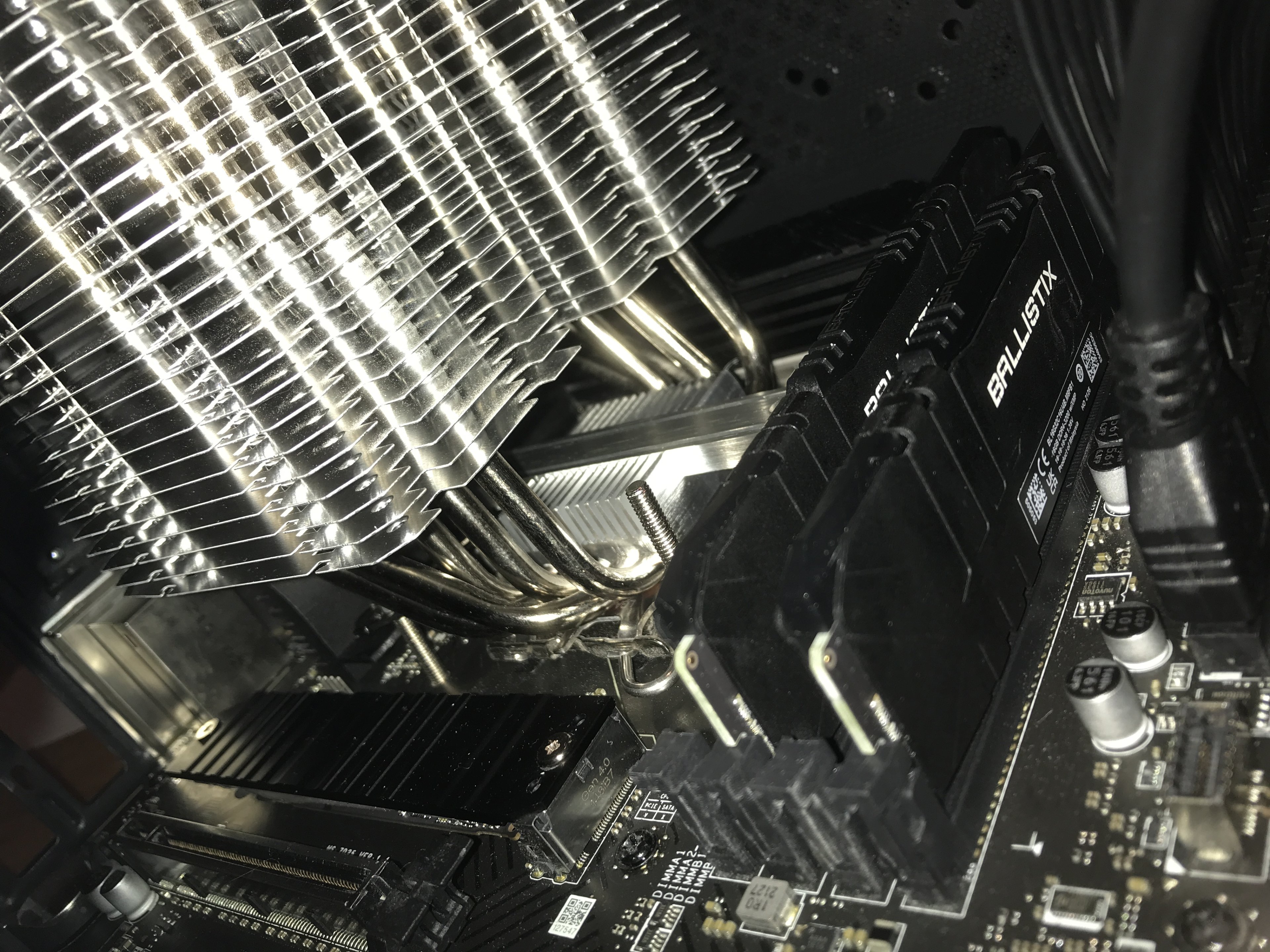 Ich habe den Kühler vom Cpu ohne Montagekit mit eigenen Schrauben etc. eingebaut. Ich habe mir Mühe gegeben, ihn ordentlich einzubauen, und das Montagekit möglicherweise nachzubestellen, um es dann ein zweites Mal “richtig” einzubauen. Der Kühler sitzt eigentlich perfekt parallel auf der Cpu drauf - ich habe die Schrauben sogar loser gemacht, weil ich gelesen hatte, dass der Kühler zu fest auf der Cpu sitzen kann, ohne Erfolg.
