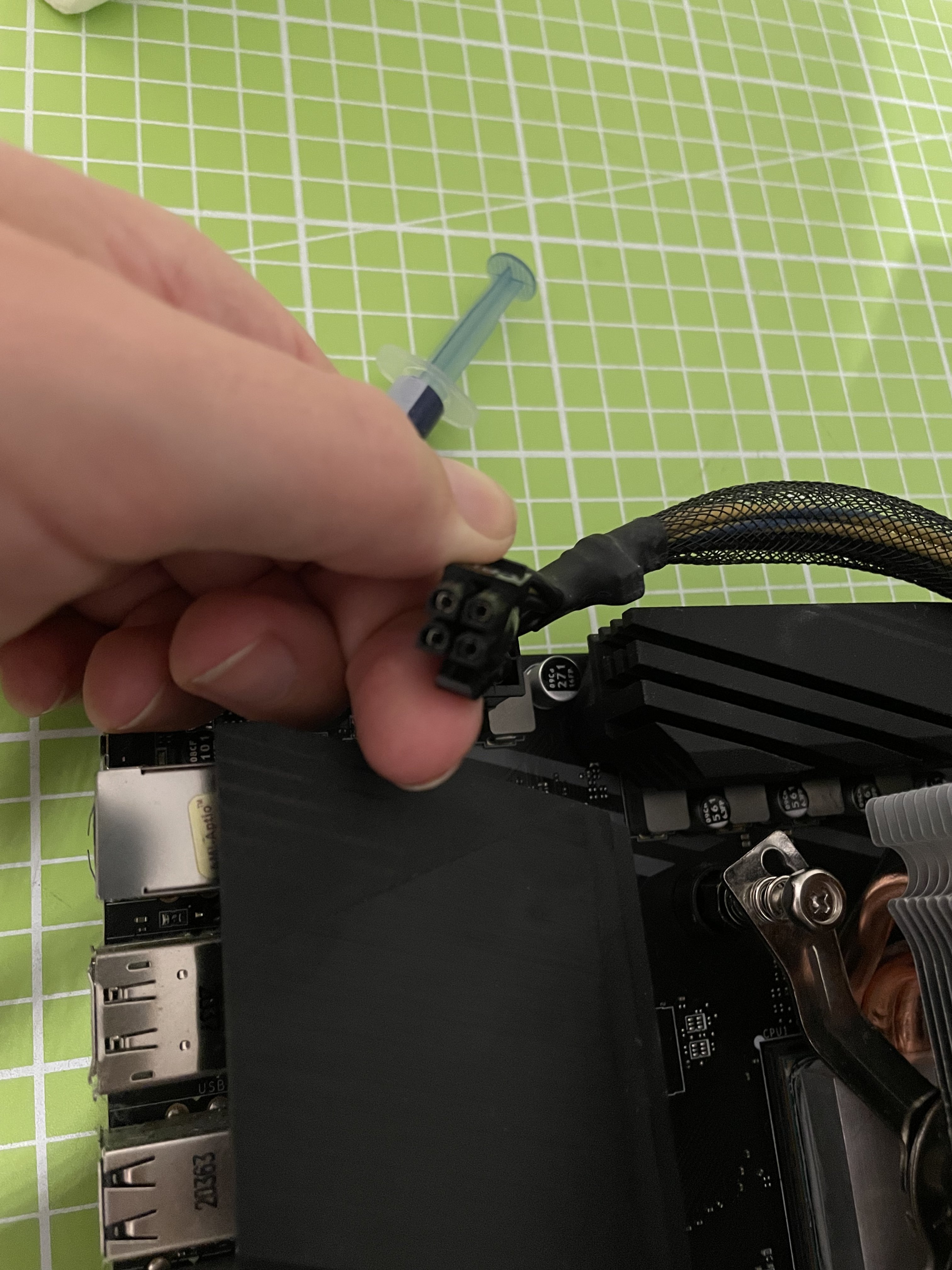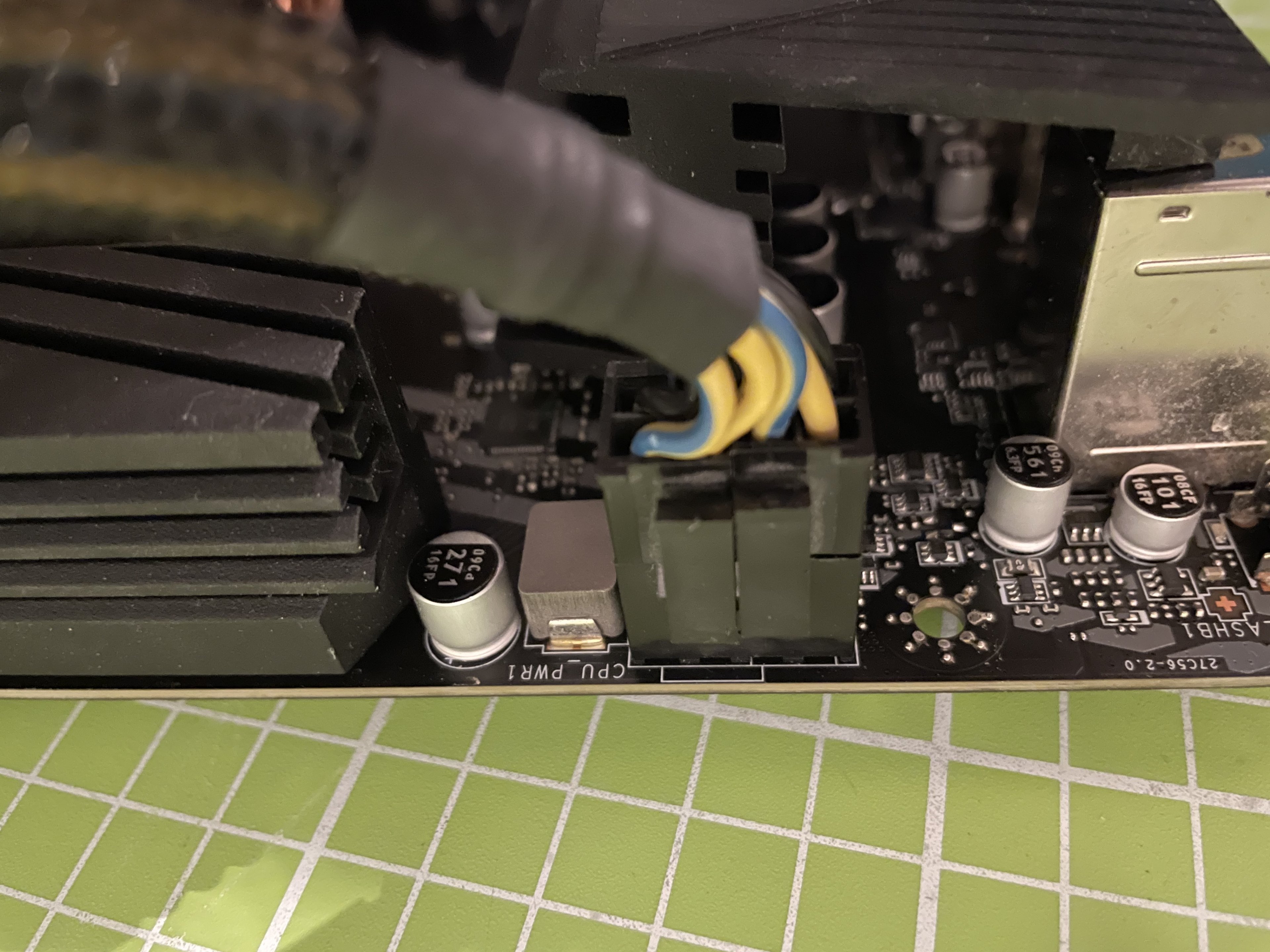 - CPU-Lüfter abgemacht und CPU und Pins angeguckt, sieht alles gut aus.