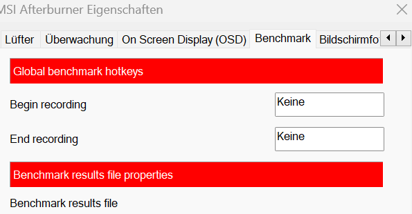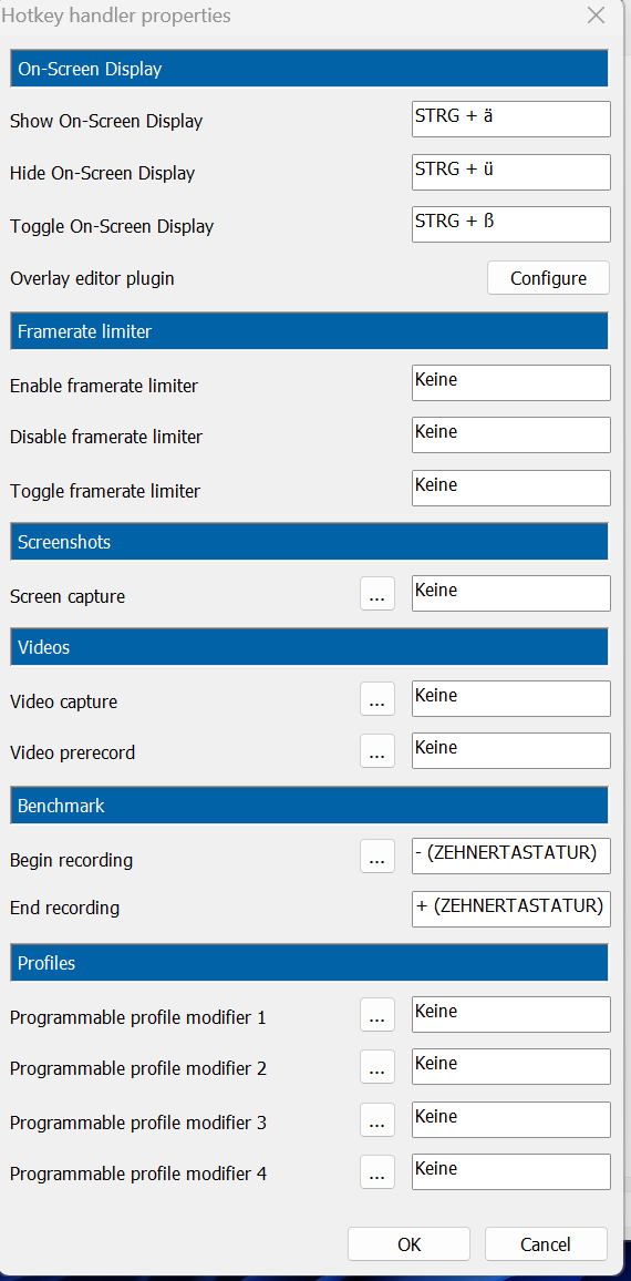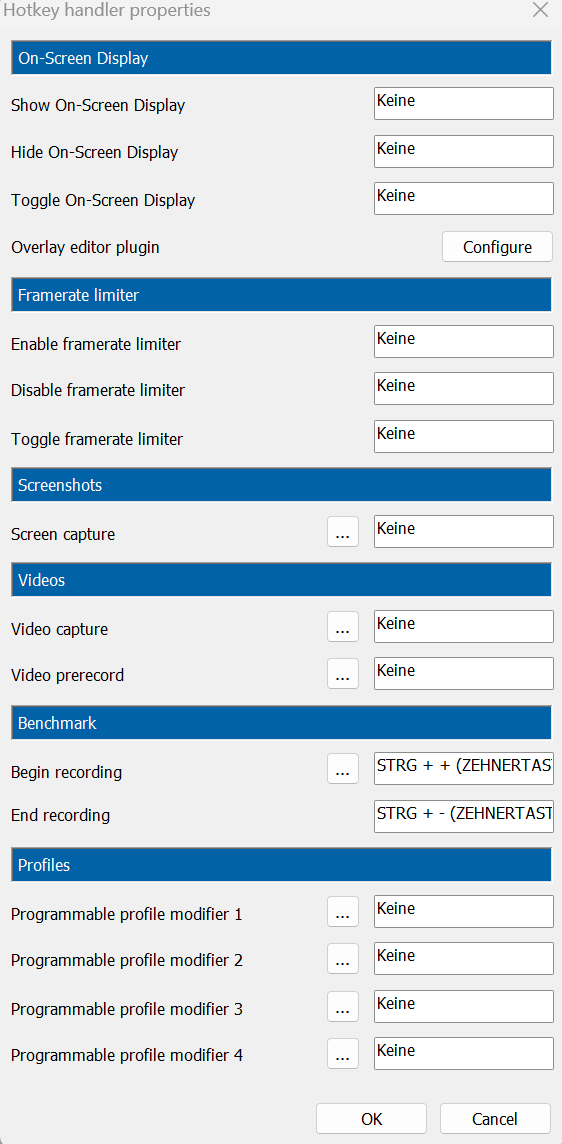 Momentan ist eingestellt, daß STRG + + (+ auf dem numpad) den Bench startet und STRG + - (Numpad) stoppt. Muß nur aktiv sein. Klappt bei mir problemlos. So kann ich das OSD ausblenden und das Framelimit an/ausschalten (jeweils Toggle mit einer Taste).