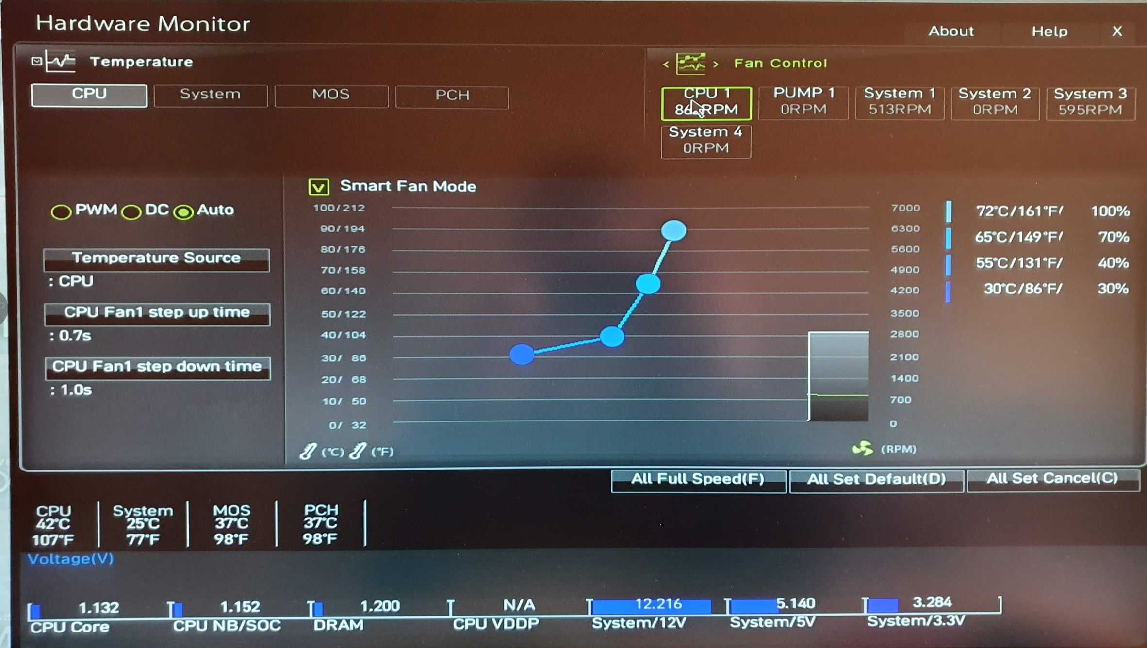 Da ich entweder blind bin oder die richtige Einstellung irgendwo anders versteckt ist als ich es vermuten würde, wollte ich mal nachfragen, ob jemand noch einen hilfreichen Tipp hat, um das ständige aufheulen der CPU Lüfter im idle zu unterbinden. Laut Ryzen Master springt die Temperatur immer mal kurz von 35 auf knapp 50°C, was ja eigentlich kein Problem darstellen sollte. Im Bios ist (CPU als Referenzquelle) eingestellt, dass bis 60°C die Lüfter bei 20% verbleiben sollen, mit der maximalen Wartezeit von 0,7s. Trotzdem heulen die Lüfter immer wieder hoch, was mich ziemlich nervt. Hab ich noch etwas übersehen oder werd ich die Kiste doch demnächst auf Festspannung umklemmen dürfen?