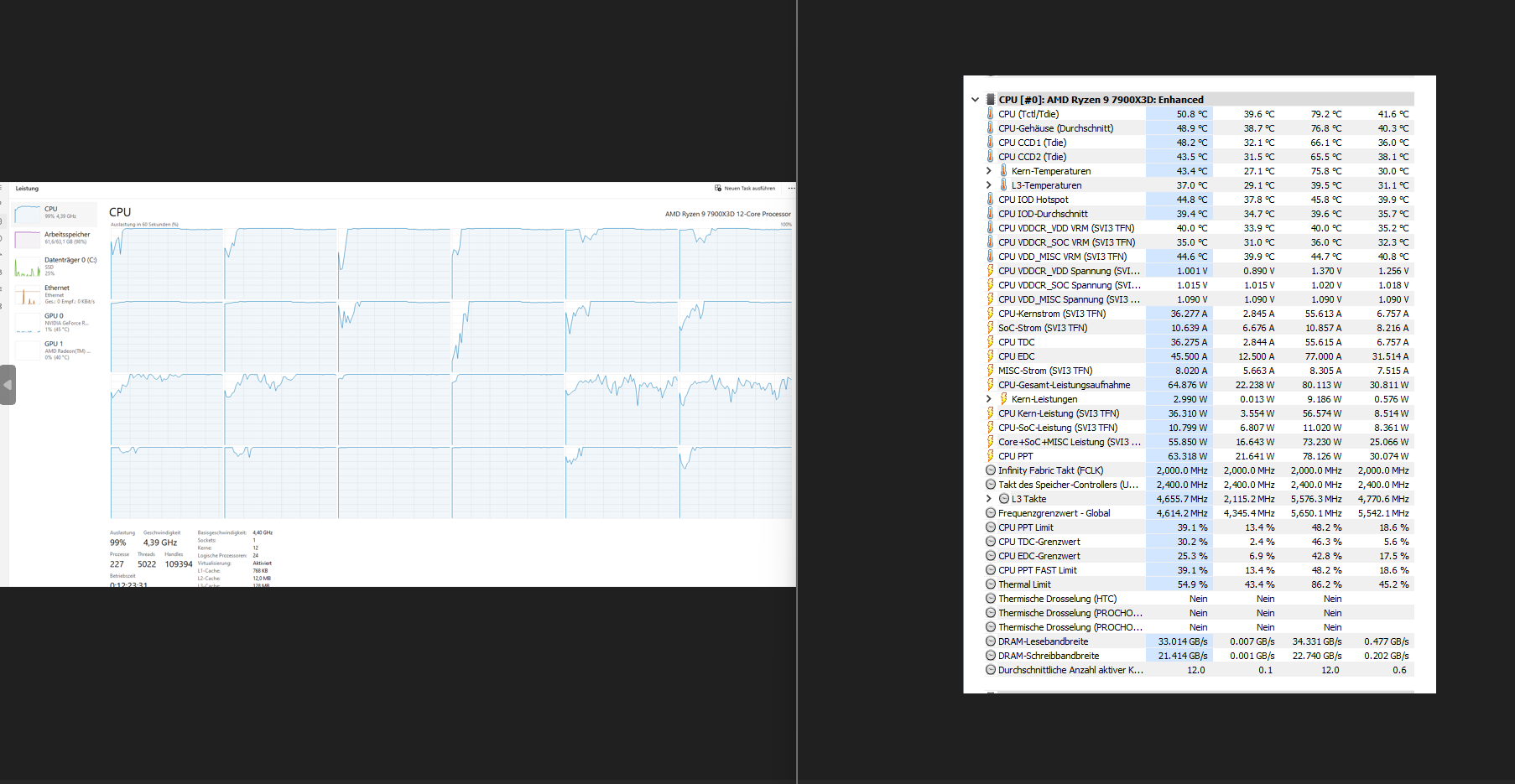 Gleiche Test mit dem selben System und Einstellungen AMD Ryzen 9 7900X eine maximal Temperatur von 91C° bei 168 Watt. Die Punkte unter dieser CPU sind ein klein wenig schlechter, ich Frage mich jedoch warum der X3D nicht seine maximale Watt zieht ?