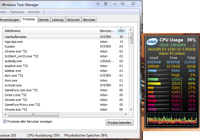 Das Problem ist, dass die auslastung von 5-7% auf bis zu 80% hochgeht aber stark schwankt. Also mal 50% dann 30 dann plötzlich 80 usw. Das resultat ist, dass mein PC total laggt und ich quasi nichts machen kann.