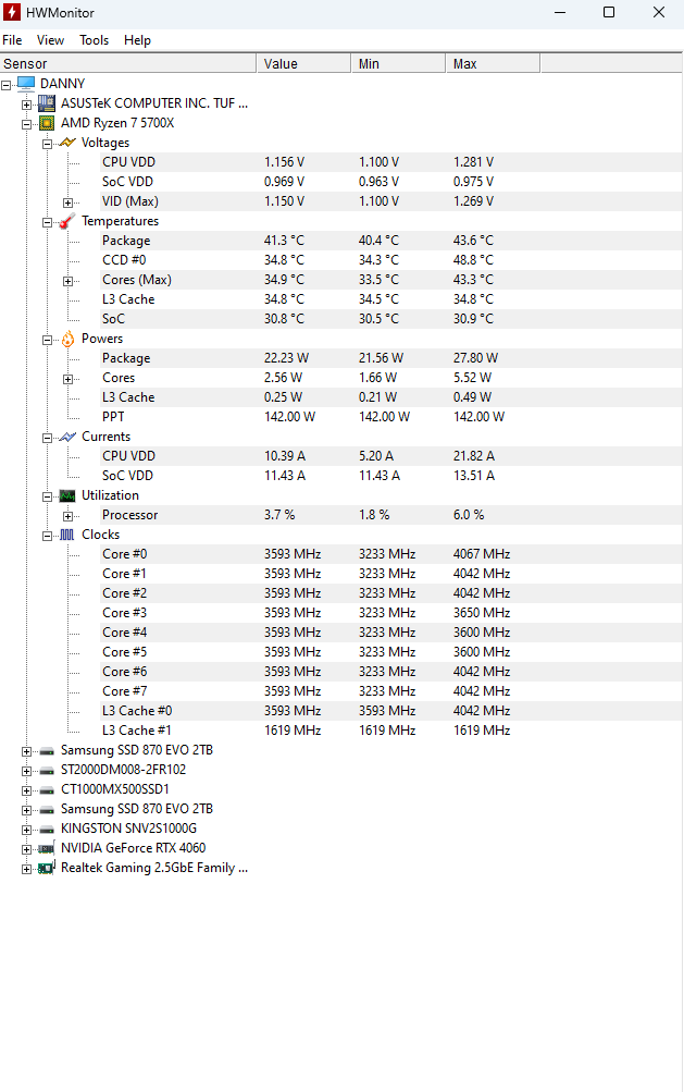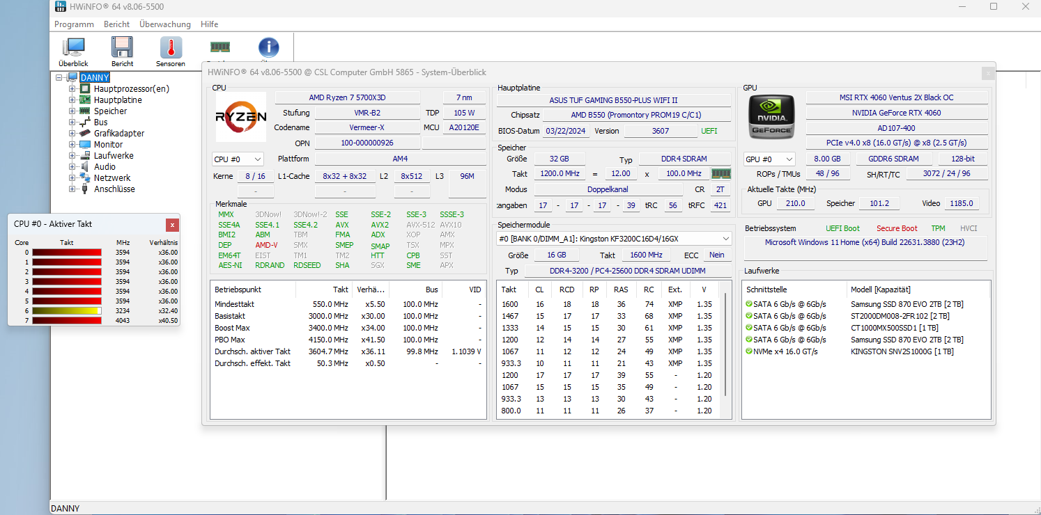 - HDD / SSD: 1x 1000 GB m.2 PCle 4.0 SSD Kingston NV2 - 2x Samsung 870 EVO 2TB - 1x Samsung Seagate Barracuda 2 TB