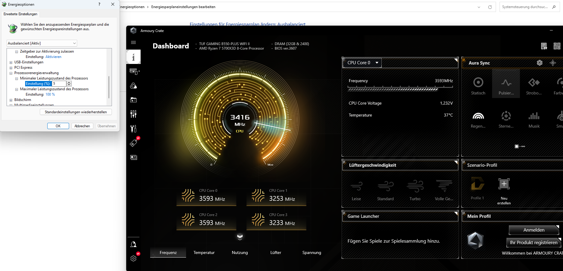 Die Energiesparoptionen sind auf "Ausbalanciert" und der minimale Leistungszustand des Prozessors ist auf 5 %. Wenn ich den Maximalen runter drossel, drosselt natürlich auch der Takt, aber sobald 100 % eingestellt sind, läuft er wieder volle Pulle.