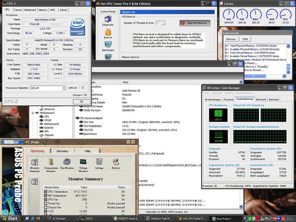 ich hab folgendes Problem. Wenn ich meinen P4 2.8GHZ auf 3.5GHZ (FSB 250MHZ) Takte zeigt Everest mir eine korrekte Taktfrequenz an sowohl im idle als auch load. Wenn ich jetzt z.b. die Cpu auf 3.64GHZ Takte und ich den Prozessor auslaste (z.b. mit Prime) fängt die Taktfrequenz unter Everest stark an zu schwanken, andere Programme wie CPU-Z oder Clockgen zeigen mir aber eine konstate Taktraate von 3,64GHZ an, was soll ich nun glauben. Dieses Phänomen fängt eben nur ab einen FSB von über 250Mhz an...