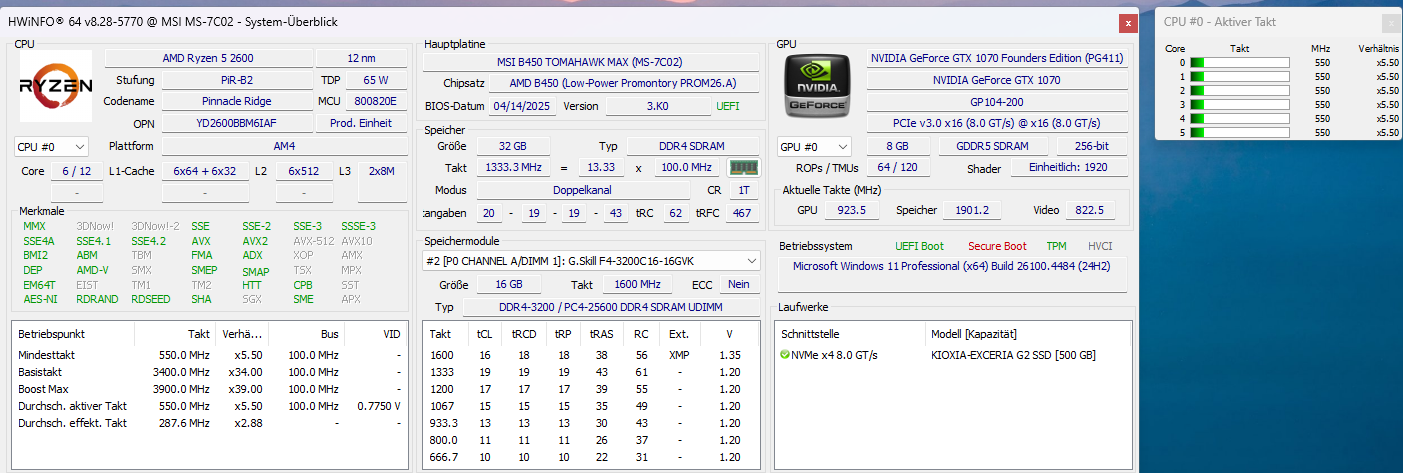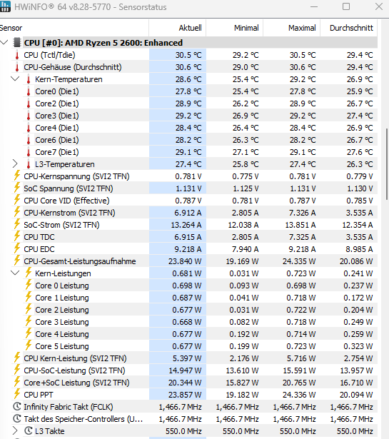 Immer beim ersten Systemstart taktet die CPU nur auf 550 MHz. Egal welches Programm oder Spiel oder Benchmark ich teste, der Takt bleibt bei 550 MHz. Habe mit HWiNFO die Temperaturen im Blick. Alle Kerne zwischen 25-30°C. Alle anderen Temperaturen ebenfalls absolut unbedenklich.