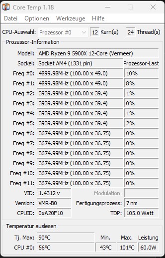 Neuer Tag: PC heute morgen hochgefahren, Edge und Citrix fürs Home Office geöffnet er fing wieder an (Lüfter drehen voll auf), also schnell Core Temp aufgemacht und von 45 GRad auf 101 Grad hoch. Also Citrix erstmal minimiert die Temp beobachtet. Jetzt liegt er bei so ca. 55 Grad.