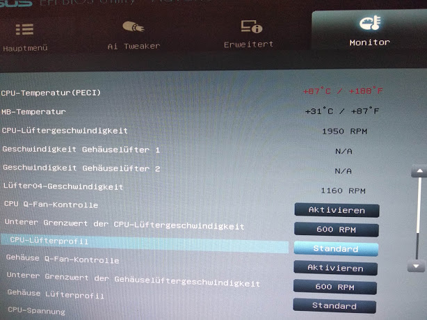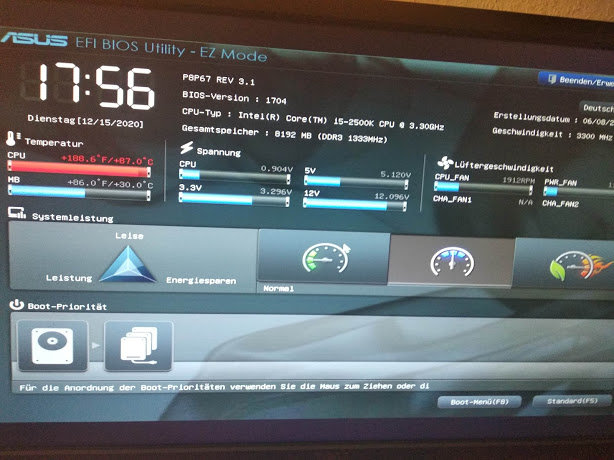 ich bekomme den PC nicht in Betrieb, da ein lautes Piepsignal (4x) ertönt, sobald ich den Rechner hochfahre. Angeblich fährt der Rechner auf 188° C hoch sobald ich ihn booten will...das kann doch nicht sein oder?