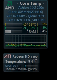 CoreTemp und dann das Gadget dazu. Sieht in etwa so aus. Das Gadget dient ja lediglich zu Anzeige der Daten, wo hingegen die Sensorenwerte von CoreTemp ausgelesen werden müssen.
