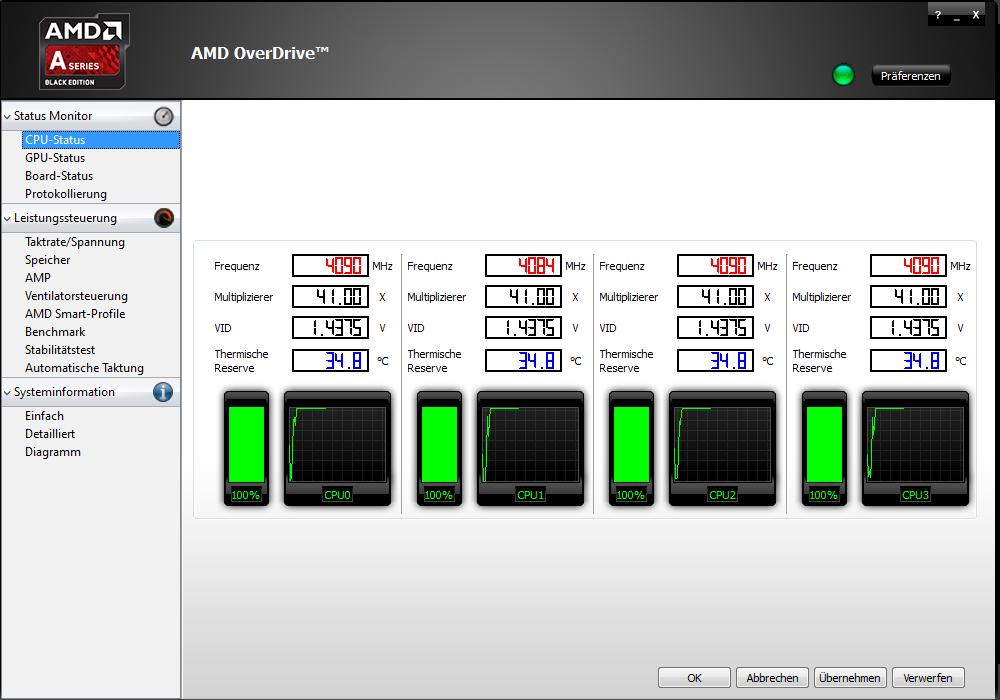 - AMD Overdrive ca. 34,8°C (thermische Reserve)