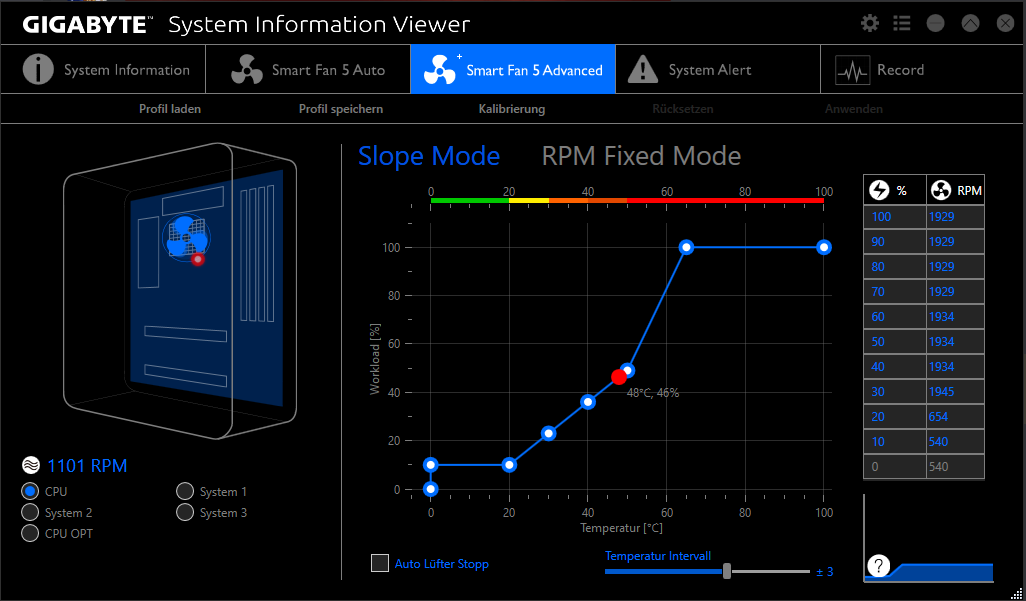 Ich öffne dann den App Center von Gigabyte und gehe auf SIV. Dann gehe ich auf Smart Fan 5 Advanced und klicke auf Kalibrierung. Danach geht die Temperatur Anzeige wieder auf unter 50 Grad zurück und er läuft Silent. Das löst aber nicht das Hauptproblem was ich habe nach dem Start des Computers.