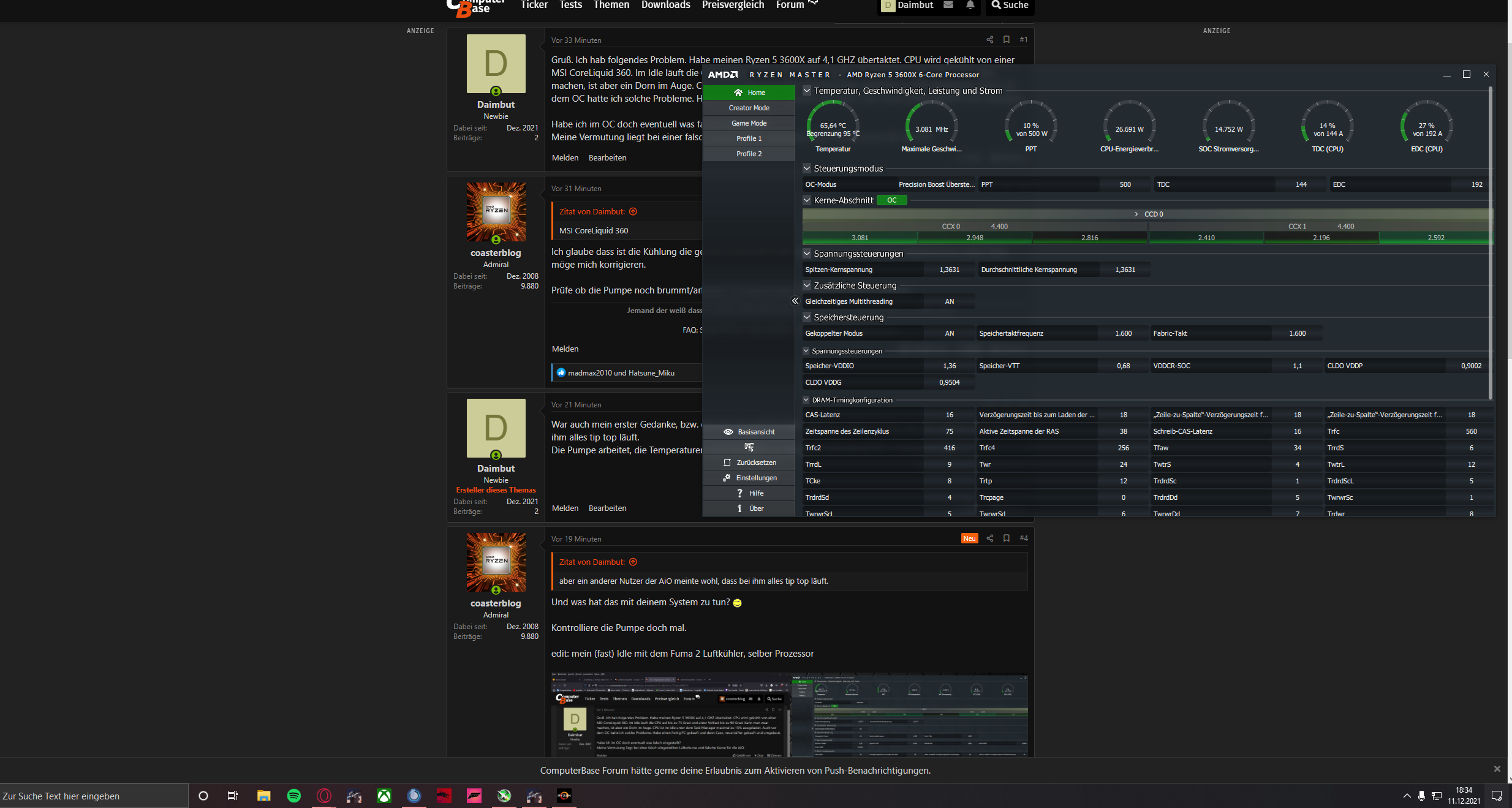 Gruß. Ich hab folgendes Problem. Habe meinen Ryzen 5 3600X auf 4,1 GHZ übertaktet. CPU wird gekühlt von einer MSI CoreLiquid 360. Im Idle läuft die CPU auf bis zu 75 Grad und unter Volllast bis zu 90 Grad. Kann man zwar machen, ist aber ein Dorn im Auge. CPU ist im Idle unter dem Task Manager maximal zu 15% ausgelastet. Auch vor dem OC hatte ich solche Probleme. Habe einen Fertig PC gekauft und dann Case, neue Lüfter gekauft und umgebaut.