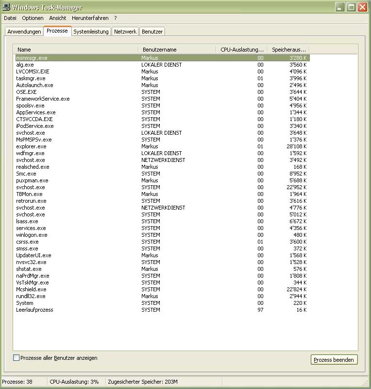 Seit kurzem aber kommt es mir vor, als ob die CPU-Auslastung bei beispielsweise einem Programmstart (Word, oder Outlook) überdurchschnittlich viel CPU braucht. Ich habe auch eine externe Soundkarte und kann mir auch wenn überhaupt kein Programm läuft kaum einen Song anhören, weil alles so stockt, es kommt unglaublich verzerrt und stockend rüber. Witzig ist, dass wenn man die Prozesse überprüft, nicht unbedingt eine extrem hohe CPU-Auslastung festzustellen ist. Es ist einfach so, dass wenn beispielsweise Ad-Aware rüberlaufen liess, ich früher, daneben problemlos noch Musik hören konnte und zusätzlich ohne Probleme arbeiten. Auch meine Maus stockt, wenn ein Programm gestartet wird und das kann es wohl nicht sein.