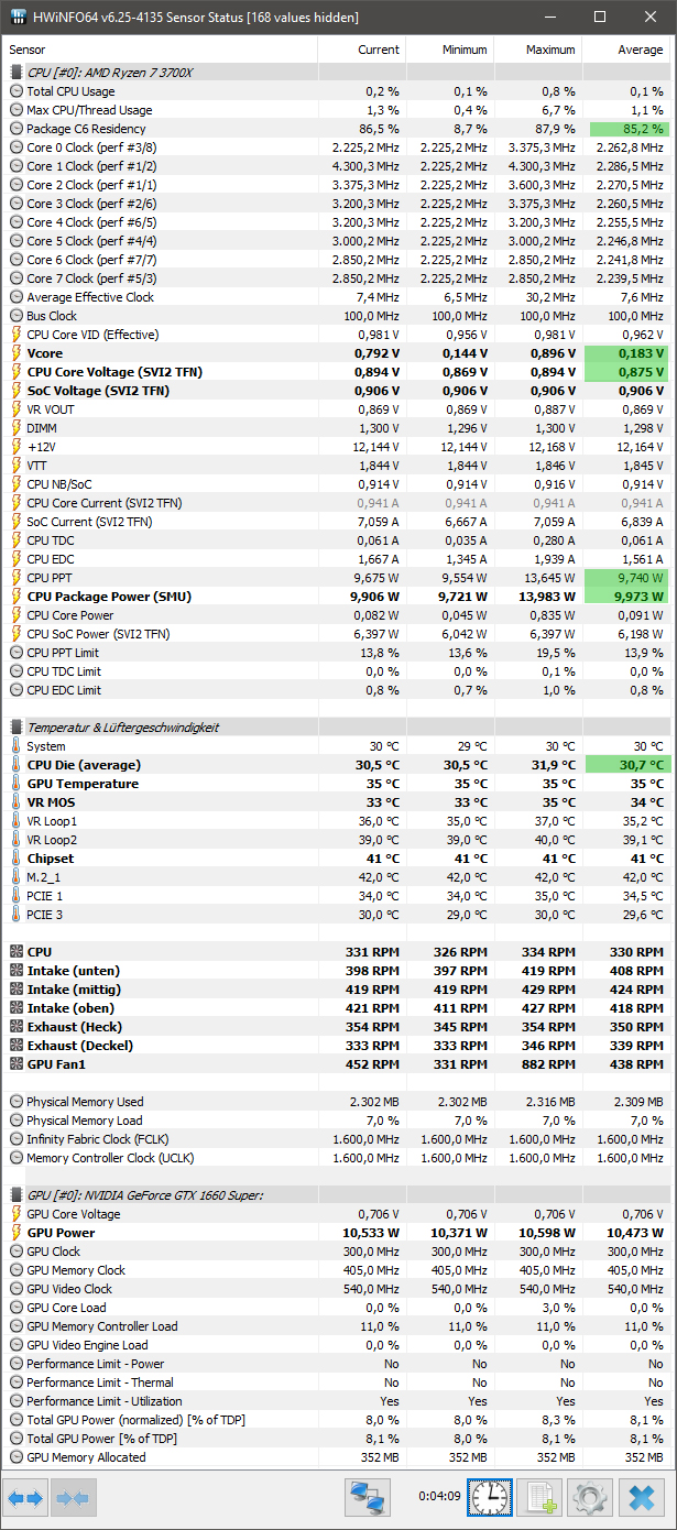 Angehangen findest Du Screenshots von HWiNFO (auf 3000 ms erhöhter Auslesetakt) im Idle (jeweils 4 Minuten nix tun) mit den unterschiedlichen Sparplänen. Wie gesagt, die Unterschiede sind nicht gravierend, aber jederzeit reproduzierbar. Gemessen mit einem 3700X, ebenso auf dem MSI Unify. Und selbstverständlich auch mit den für Zen2 empfohlenen BIOS-Settings.