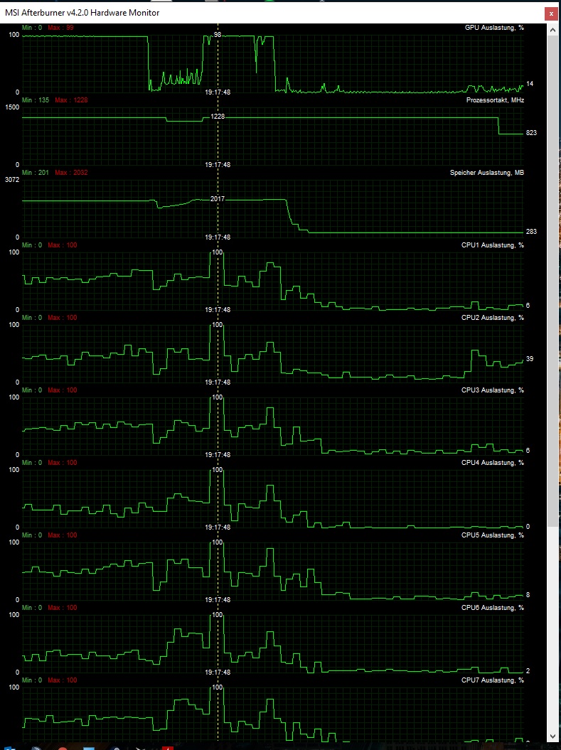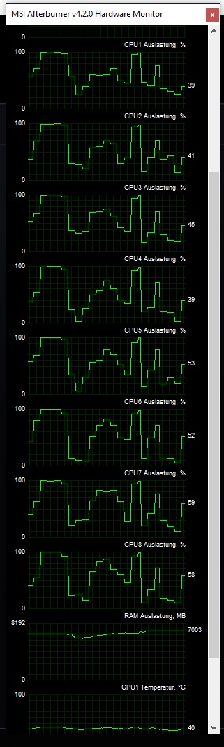 Die Auslastung von Graka und CPU scheint erstmal normal, Graka bei ~98%, die einzelnen CPU Kerne bei 60-70%.