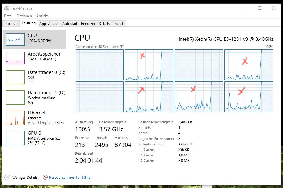 Gerade startete ich eine sehr rechenintensive Operation und wollte meine CPU-Auslastung beobachten. Die rot markierten Kerne sind alle die, welche korrekt arbeiten und nun auch voll ausgelastet sind. Alle anderen nicht markierten CPU´s zeigen leider dauerhaft Vollast an...