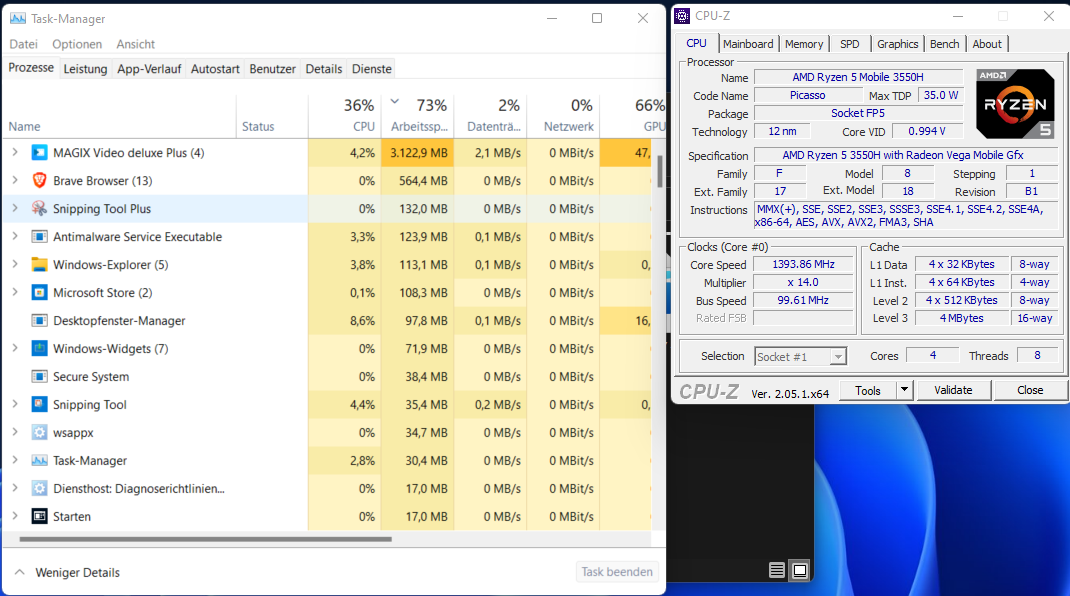 Bei der Probe ist mir aufgefallen, dass laut Taskmanager die CPU Leistung bei 10-15% liegt. RAM 70% ausgelastet.