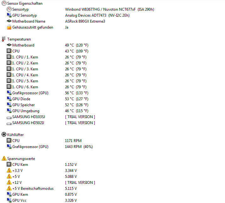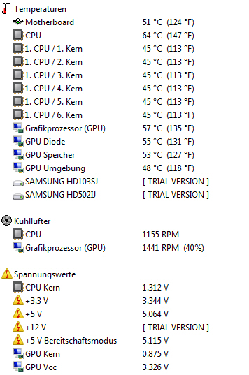Jetzt ist es so dass mir CoreTemp im Idel so um die 24 ° C anzeigt, im Bios steht aber 49! naja und Speedfan spinnt total da gibt mehrere Werte die Blitzschnell zwischen 30 und 75 schwanken.