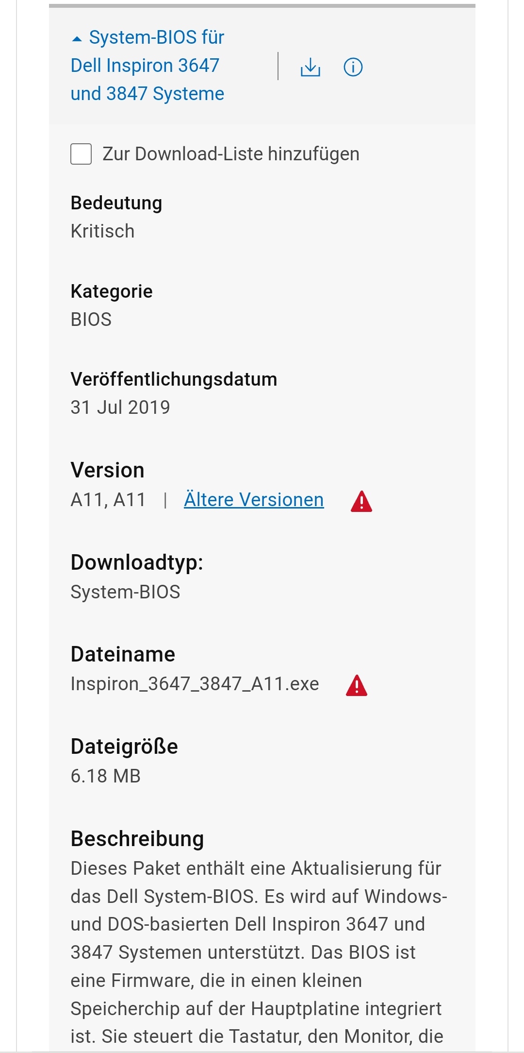 Meine Bios Version ist diese hier: BIOS-Version/-Datum Dell Inc. A11, 07.05.2019