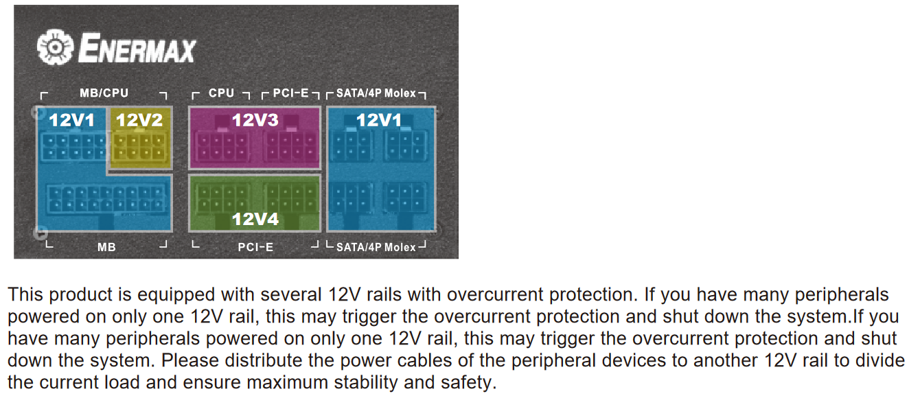Du hast wieder ein Multirail-NT gekauft. Bei diesen muss man aufpassen, dass man die Last verteilt, sonst gehen die Schutzschaltungen los und das Teil schaltet sich ab.
