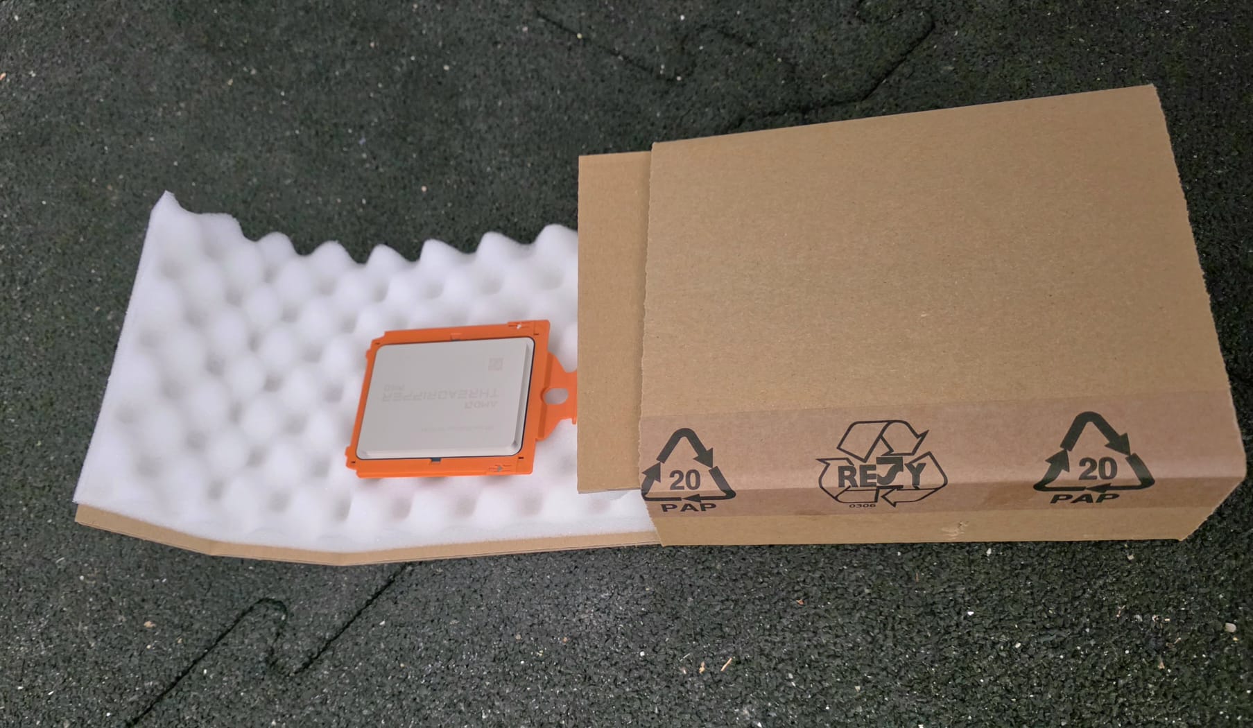 Stellt kein Problem da. Elektrostatisch kann sich erstmal nichts aufladen, der Pappkarton schütz mindestens vor direkter Reibung mit der Hardware. Und die CPU hat keine herausstehenden Pins mehr, die umknicken können. Gepolstert ist es auch gewesen. Ich würde auch sagen, alles okay.