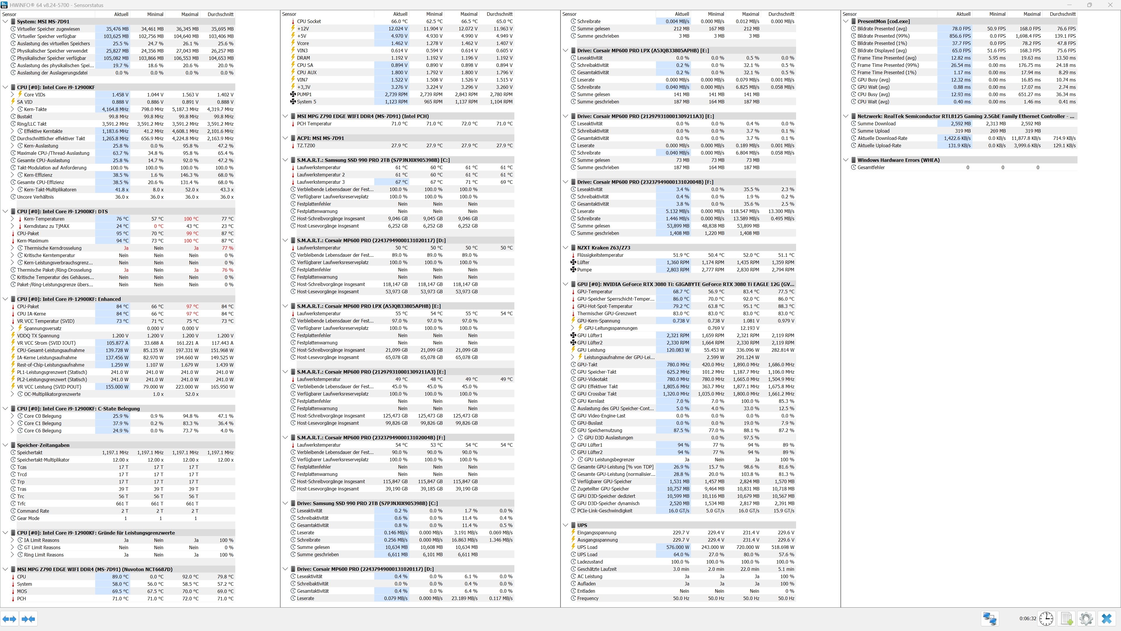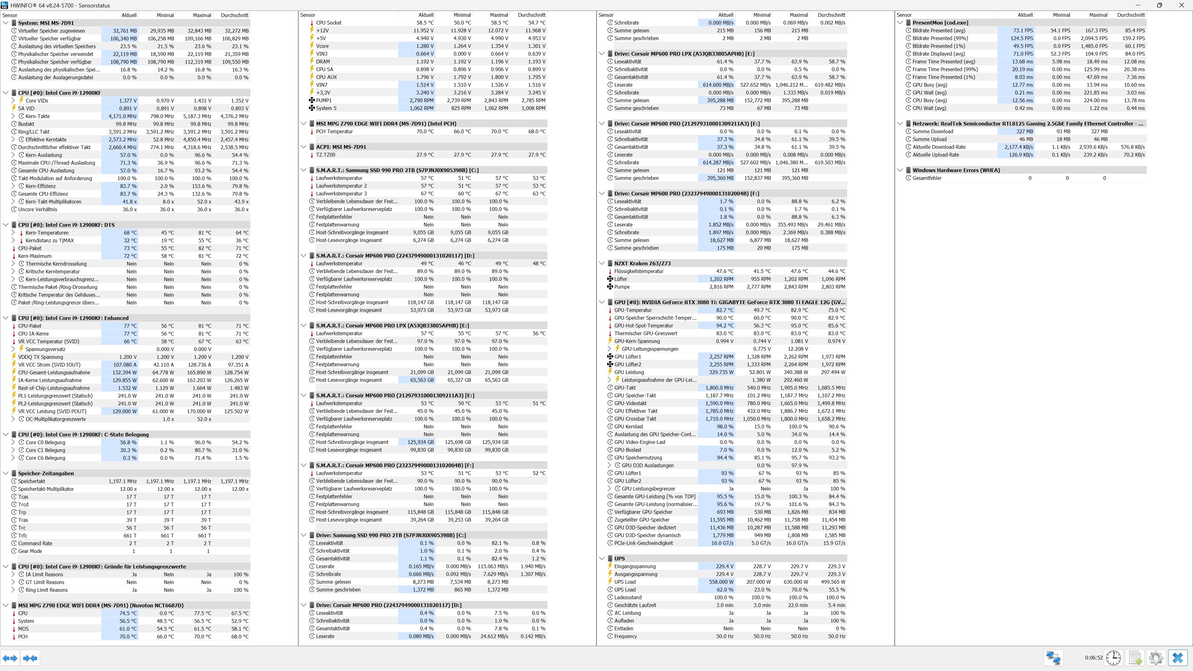 ich habe einen 12900KF, 128GB DDR4 RAM, 3080TI und 5 x 2TB nvme und eine Kraken Z3. Ich musste das Board tauschen von einem Gigabyte Z790 Gaming DDR4 zu einem MSI Z790 Edge Wifi DDR4. Seitdem, trotz Kyronaut WLP, CPU im Leerlauf bei 39° aber bei CoD Bo6 Multiplayer in UHD meist um die 100°. Das hatte ich auf dem Gigabyte Board nicht. Da ich den Rechner auch produktiv nutze nutze ich keinerlei OC.