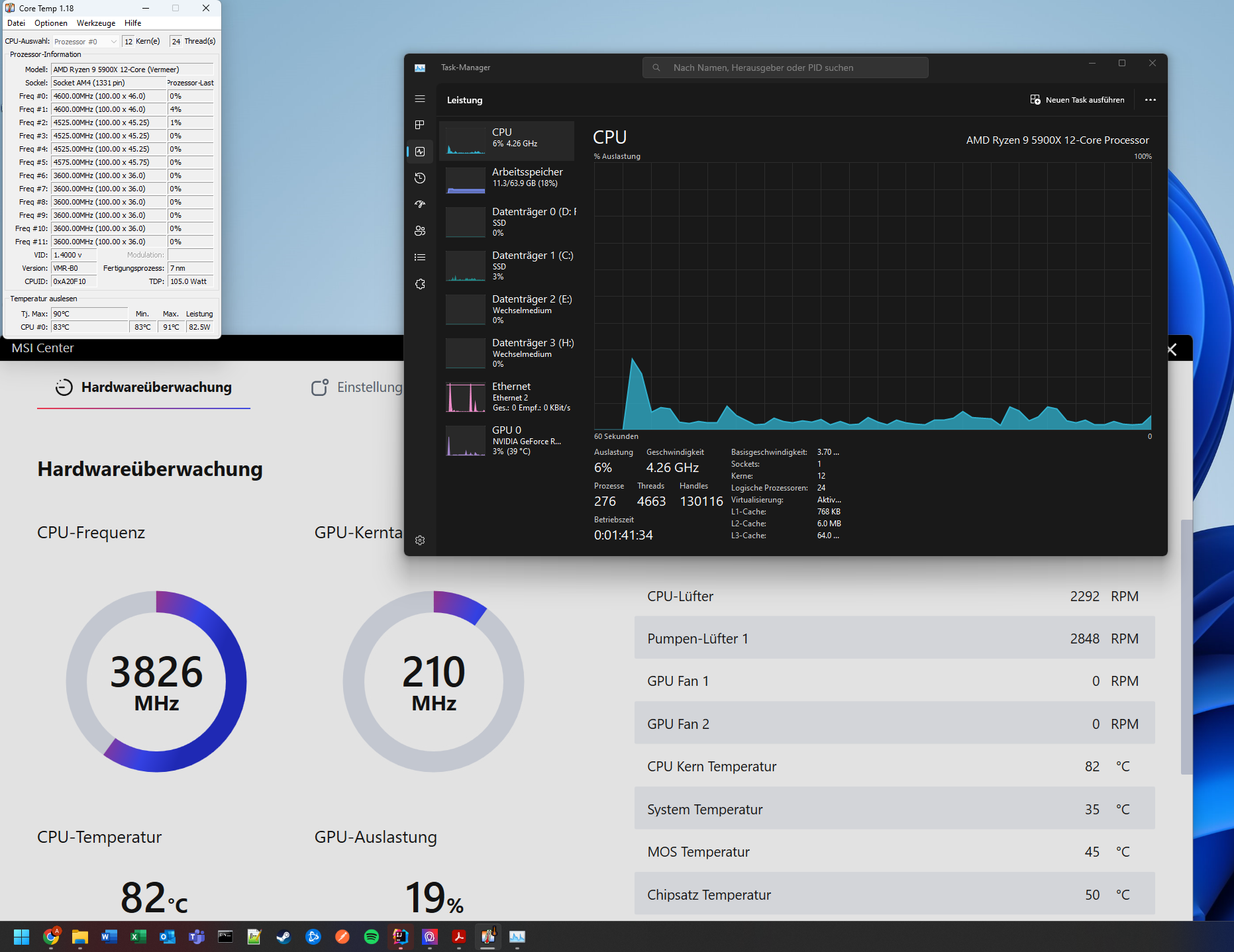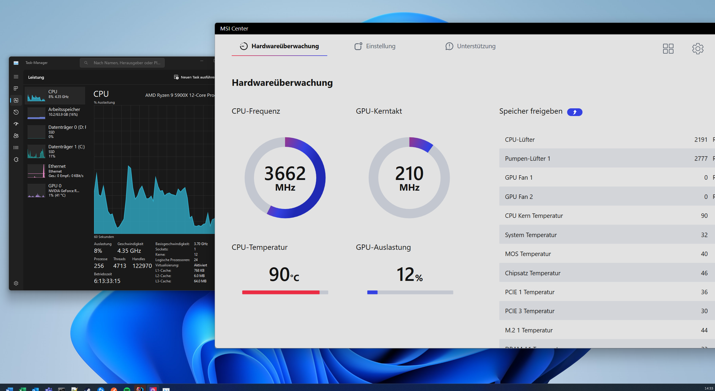 Bei leichter Arbeit am PC (E-Mails lesen, Surfen, PDF öffnen) steigt die Temperatur sofort auf 90° an und bleib ziemlich konstant auf dieser Temperatur.