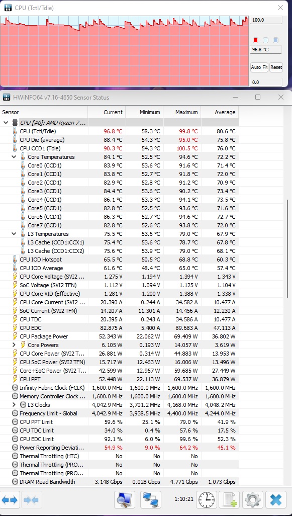 Nachdem ich HWinfo runtergeladen habe, wurde die CPU nach knapp 5 Minuten Warzone spielen schon um bis zu 99.8°c heiß. Normalerweise spielt Sie nicht solche Spiele wie Warzone aber wollte mal ein CPU lastiges Spiel testen. Ich habe gestern bemerkt gehabt das die CPU auch selbst bei Spielen wie Lost Ark oder Valorant (und vielleicht nebenbei noch einen Stream offen) auch mal über 100°c heiß war (laut dem Maximum bei HWinfo). Der Pc wird echt sehr laut.