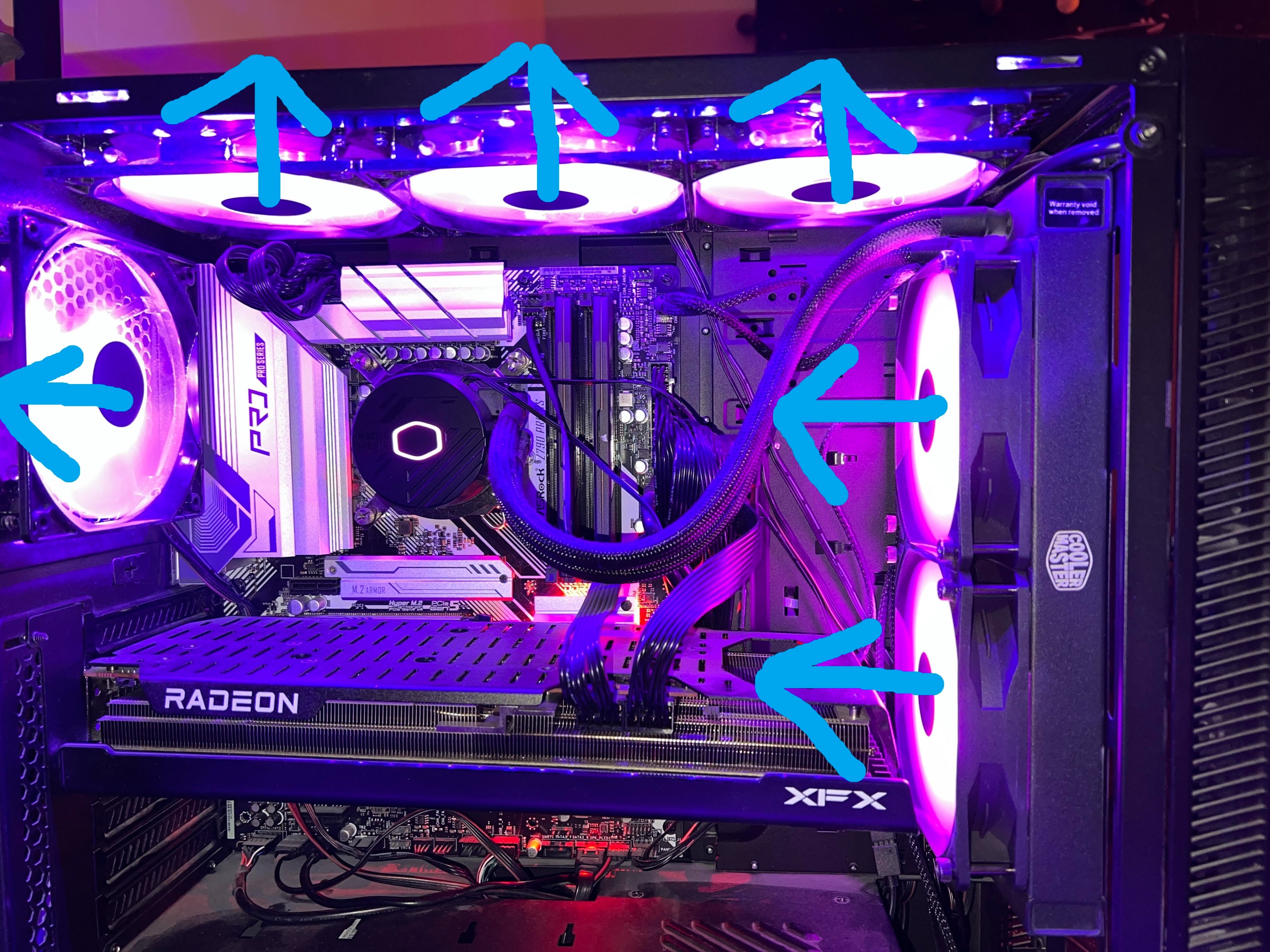 mir ist heute aufgefallen, dass im Gaming meine CPU zu heiß wird. Idle habe ich ca. 50°C, unter vollast komme ich aber schon an die 95-100°C. Nun die Frage, habe ich meine AIO falsch montiert oder ist diese defekt? Wenn ich an die Schläuche fasse vibriert der im Bild gut zu erkennende Schlauch, der dahinter versteckte vibriert jedoch gar nicht, soll das so? Wäre es unter anderem auch möglich, dass die Wärmeleitpaste nicht ausreicht oder falsch ist? Bild ist unten eingefügt.