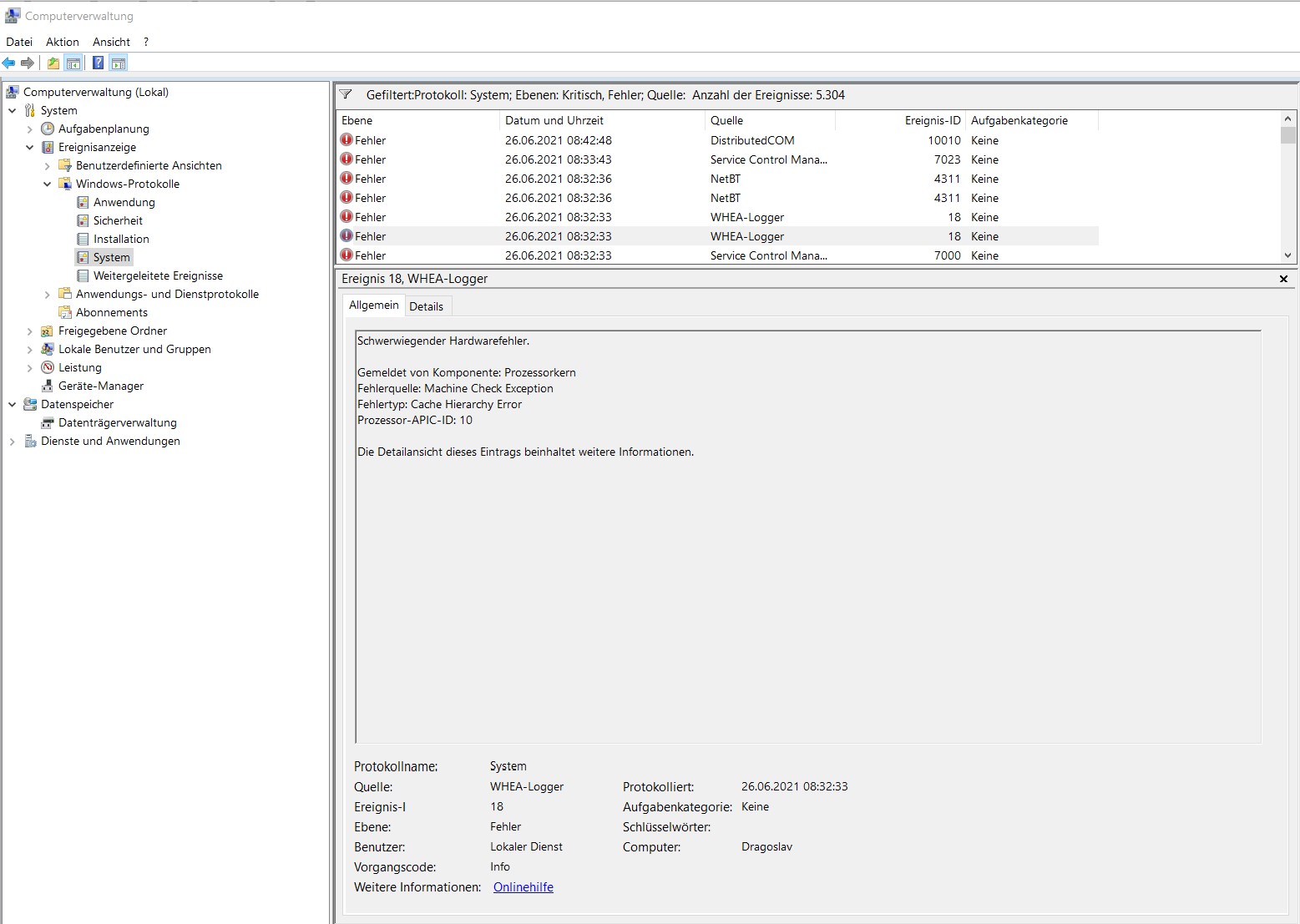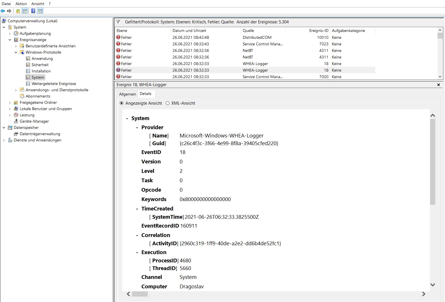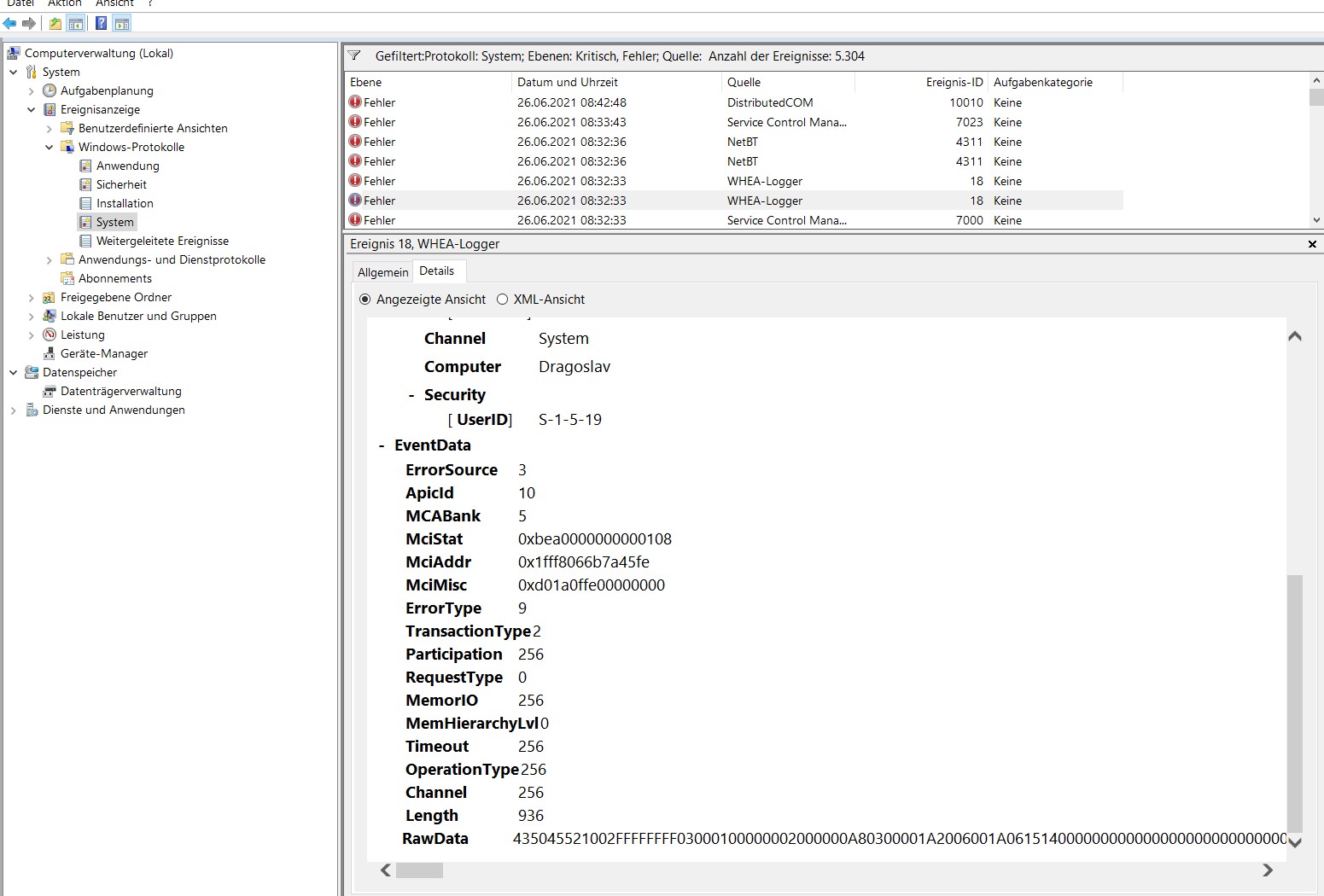Nach dem Neustart sehe ich im System-Protokoll der Ereignissanzeige zwei WHEA-Fehler (siehe Screenshots). Dieser Fehler lässt sich mit dem gleichen Vorgehen reproduzieren.