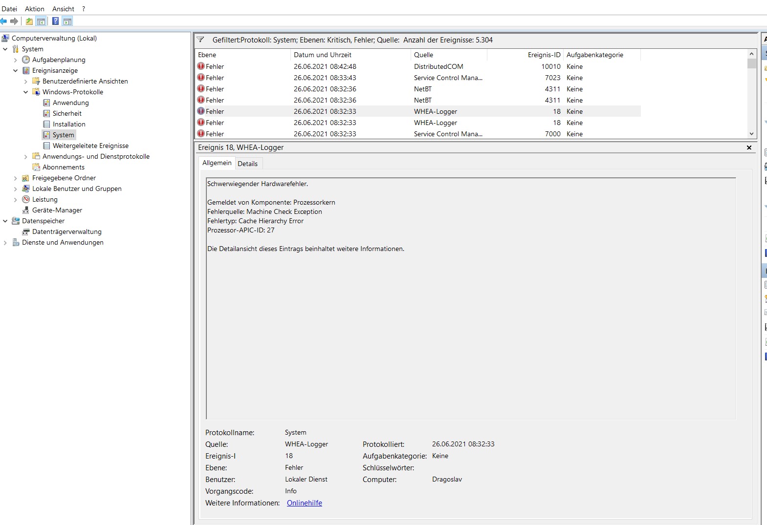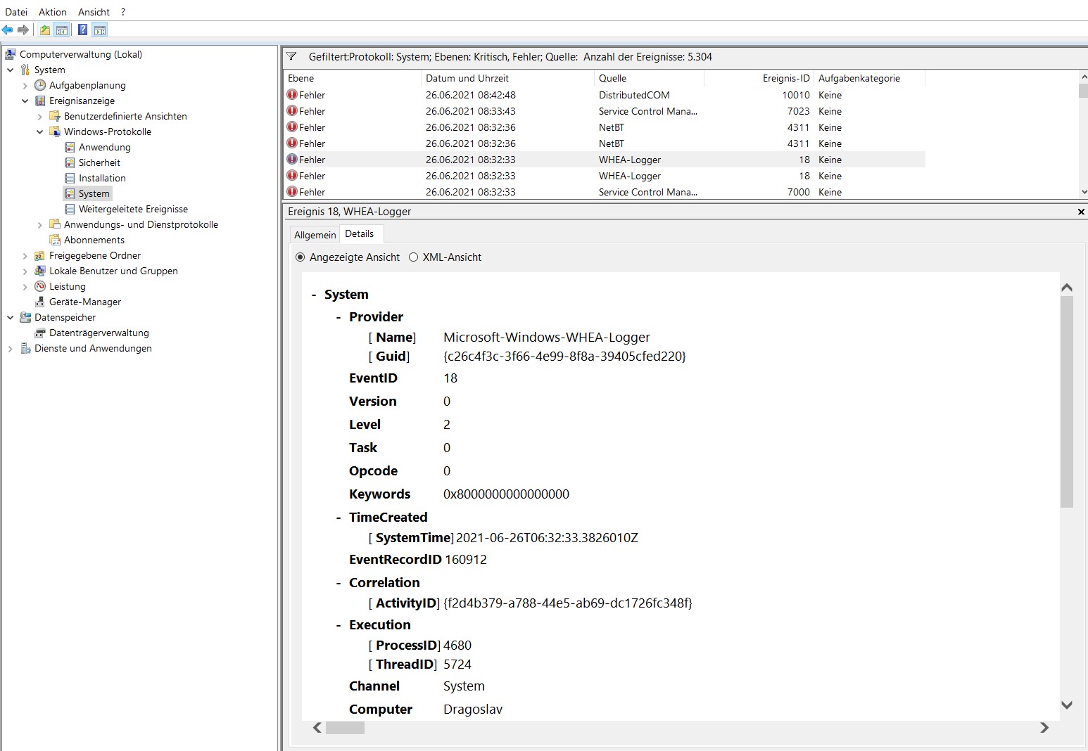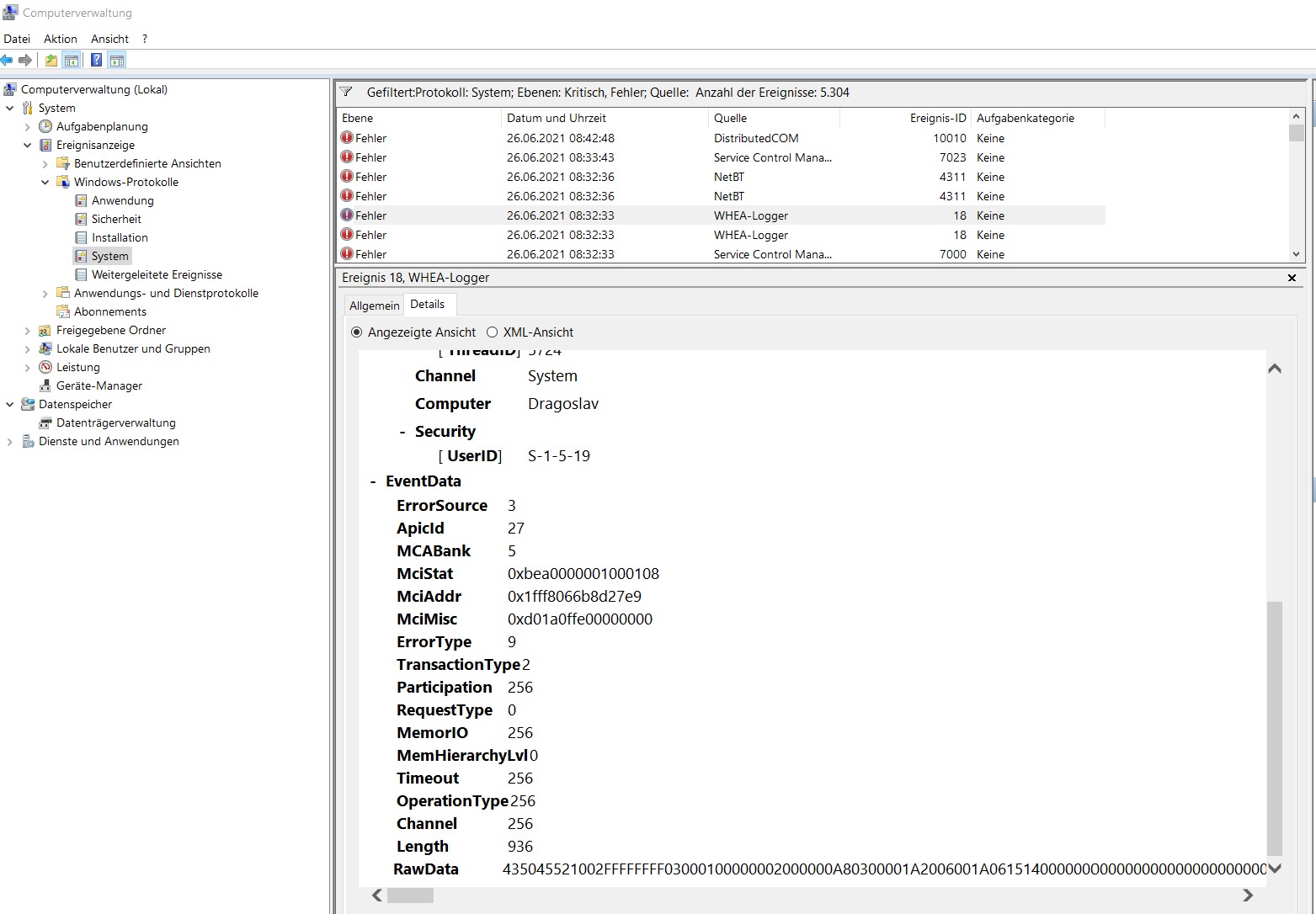 Nach dem Neustart sehe ich im System-Protokoll der Ereignissanzeige zwei WHEA-Fehler (siehe Screenshots). Dieser Fehler lässt sich mit dem gleichen Vorgehen reproduzieren.