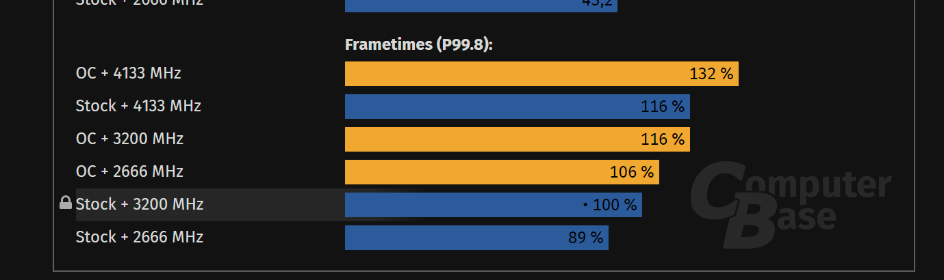 Bei CS haben wir selbst bei den extremsten Ausreißern bei Stock +2666 MHz 349,7 FPS zu OC+ 4133 MHz mit 378,5 FPS Unterschied 8%. Bei Stock 3200 MHz zu 4133 MHz sind das gerade mal 2%. Die Person, die hier den Unterschied von extremsten Wert 349,7 FPS zu 378,5 FPS mit 29,7 FPS mehr sehen und unterscheiden kann, will ich sehen.