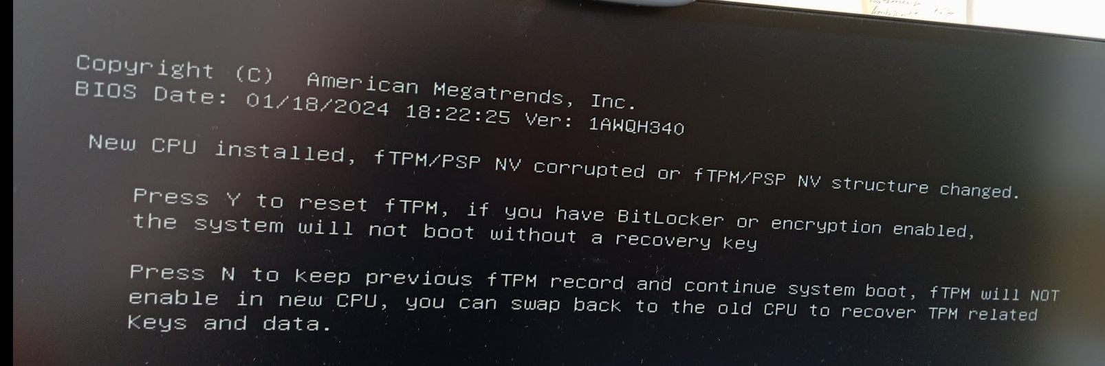 Hallo, an meinem PC wurde nichts verändert. Beim Neustrat erscheint die Mitteilung neue CPU , ich muss jetzt immer N drücken